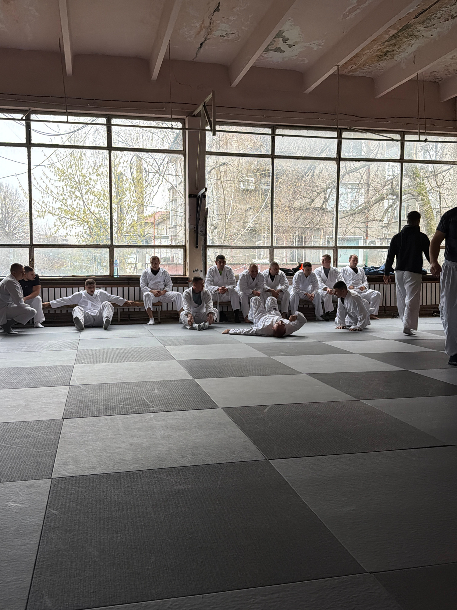 A group of about 15 people are in a room, likely a dojo, with a large window showing trees and buildings, possibly in Pazardzhik, Bulgaria. Most are wearing white martial arts uniforms. Some are sitti…read more