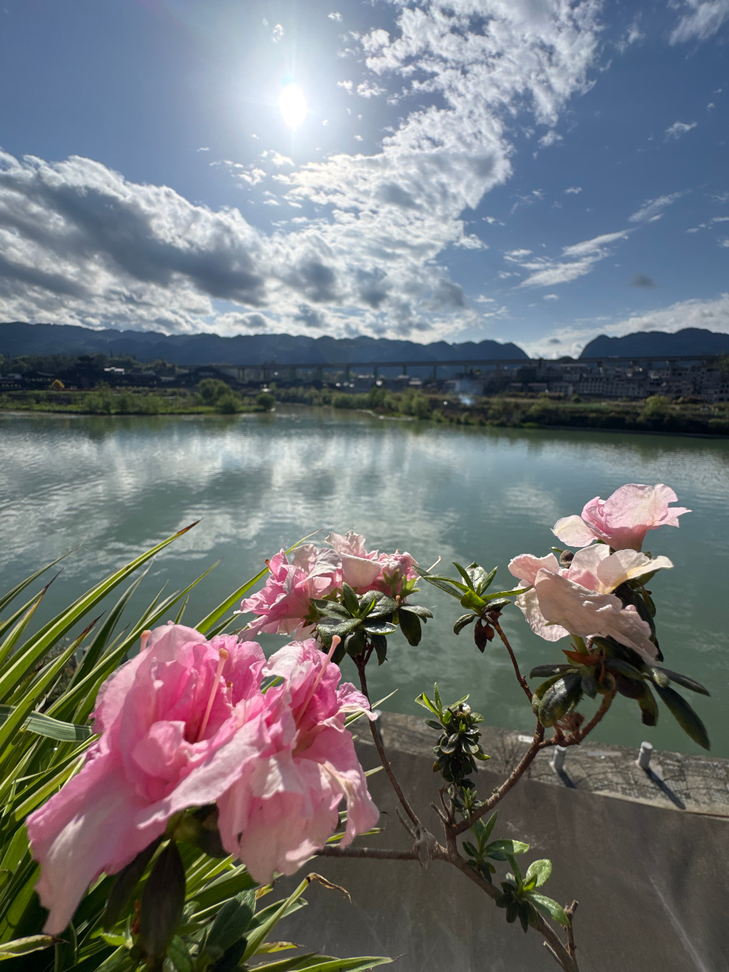 The image depicts a scenic view with pink and white azalea flowers in the foreground. These are growing in green and white striped leaves, with a concrete barrier behind. Beyond this is a lake with re…read more