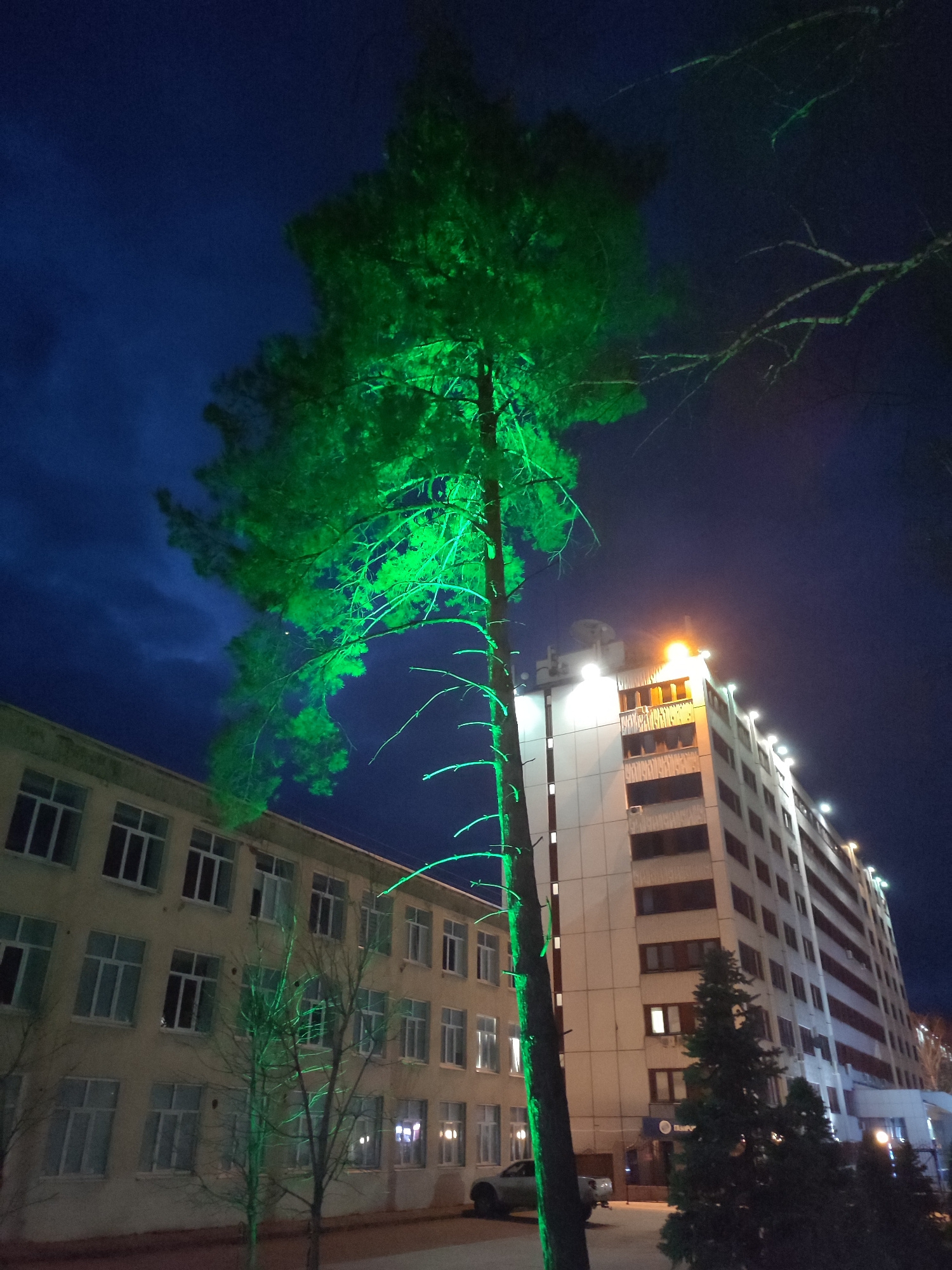 This nighttime photograph, taken in Chaikovsky, Russia, captures an urban street scene featuring a striking, brightly illuminated green tree. A very tall, slender conifer tree, possibly a pine, stands…read more
