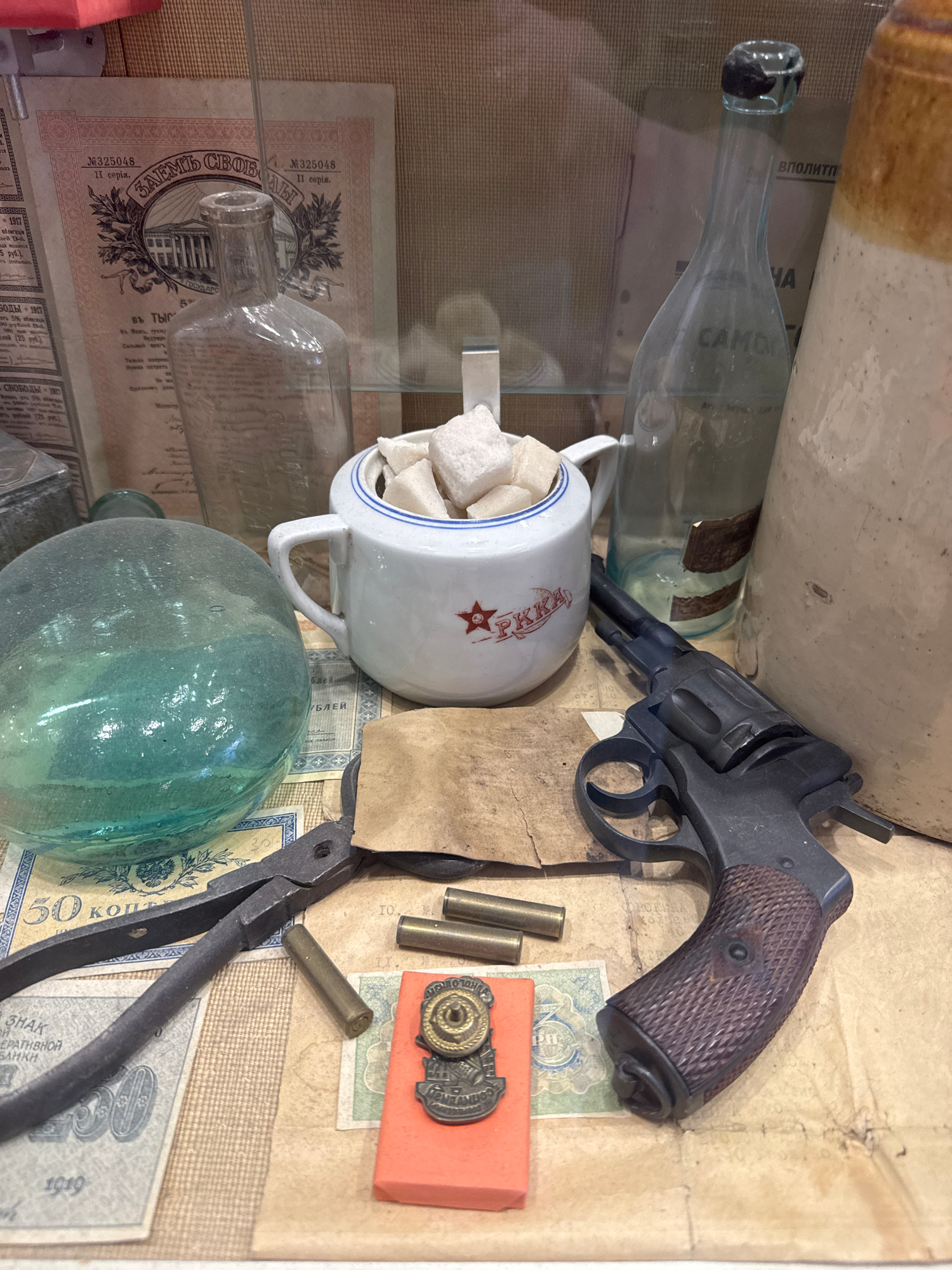 This is a still life photograph of assorted objects arranged on a surface. The items include a black revolver, empty bullet casings, a white mug with a red star and Cyrillic text, a glass bottle, a bl…read more