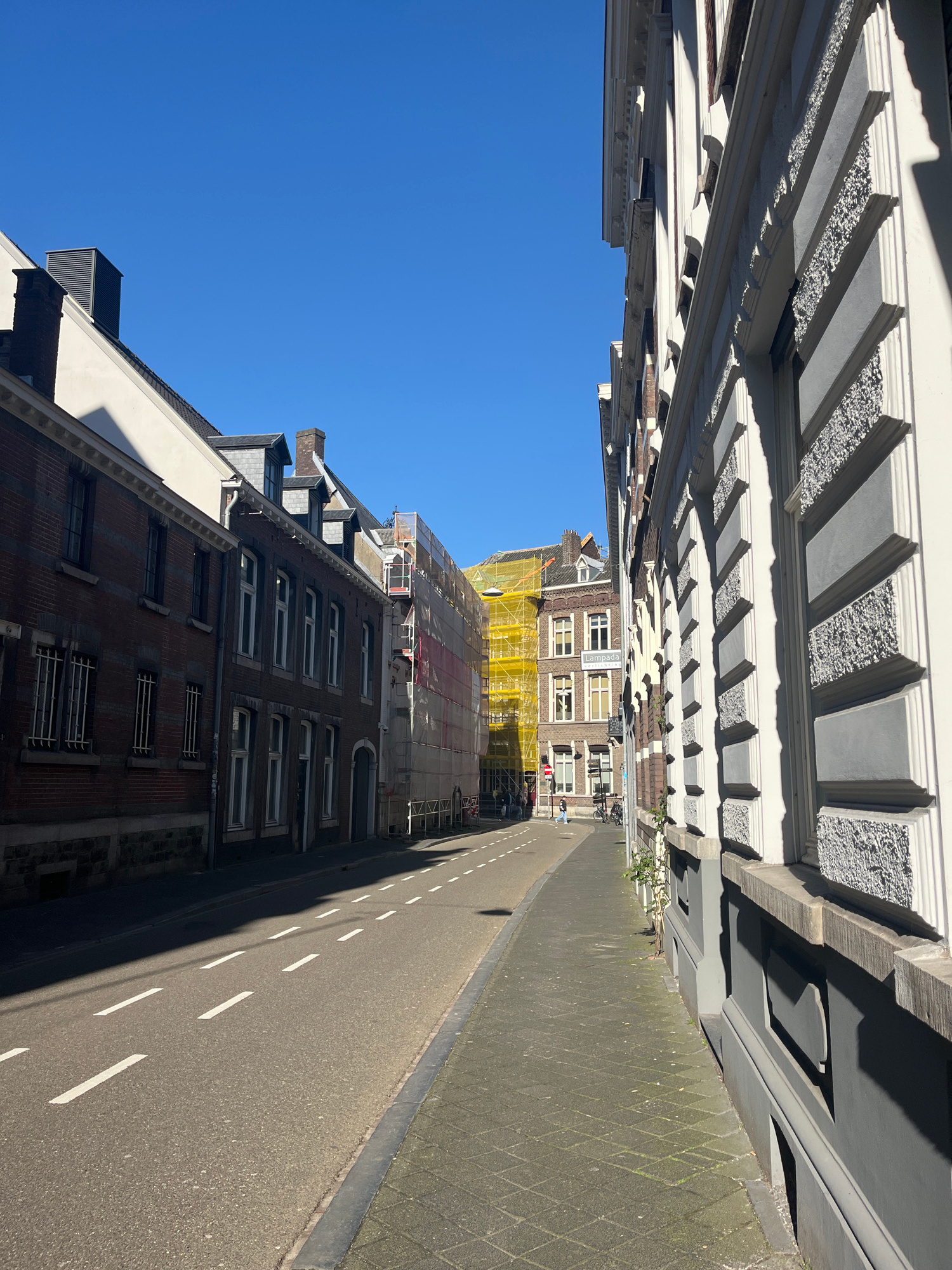 This street-level, eye-level, outdoor photograph depicts a narrow street in Maastricht, Netherlands. The buildings on either side exhibit varying architectural styles, including intricate stonework an…read more