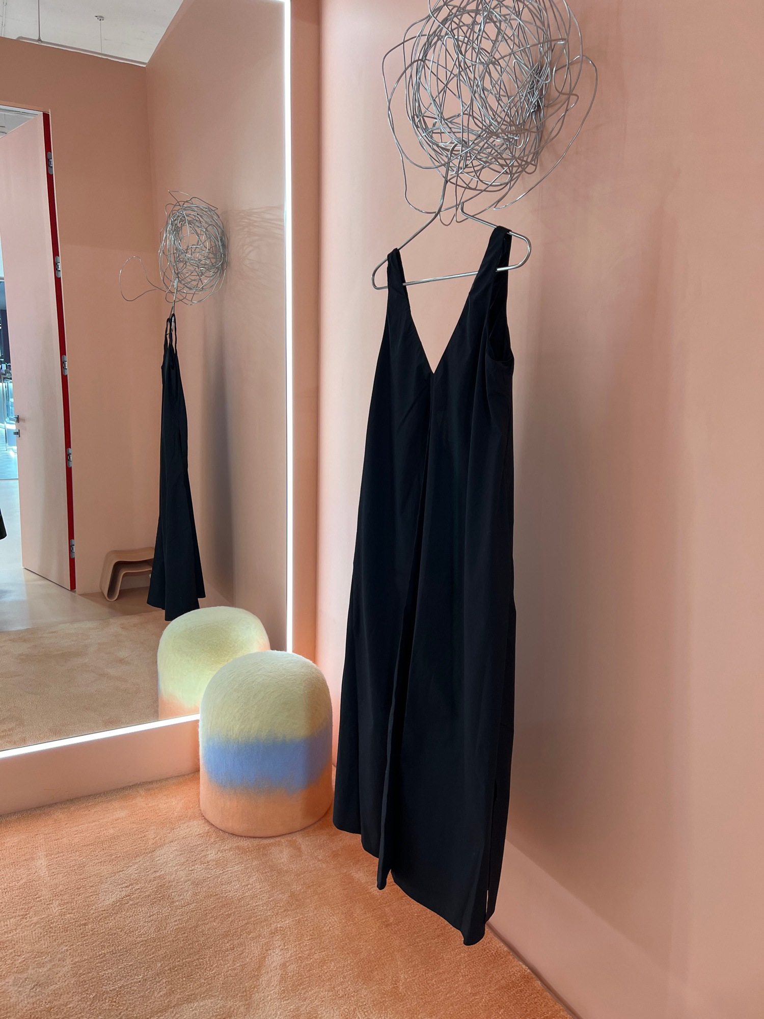 The image shows a retail space with an upside-down perspective. A black garment is suspended on a hanger, next to a wire sculpture. In front of these, there is a mirror reflecting the same display. Ne…read more