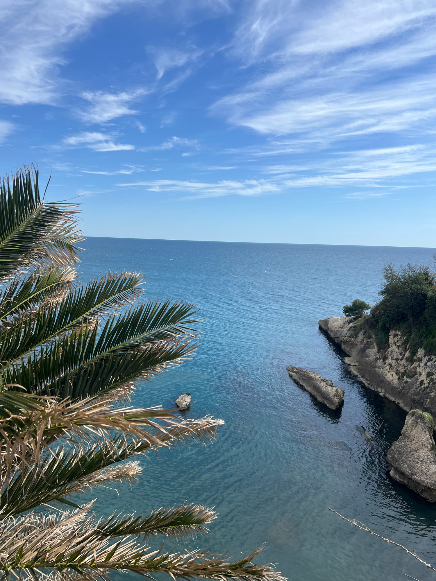 The image shows a coastal scene in Ulcinj - Ulqin, Montenegro. The right side of the image includes a rocky cliff covered with some vegetation. Below it is a section of the Adriatic Sea, containing su…read more