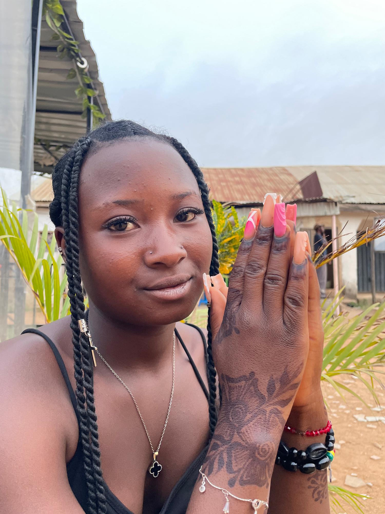 A close-up, slightly rotated shot shows a Black woman with braided hair and a nose piercing. She's wearing a black top and a silver necklace with a clover pendant. Her hands, adorned with intricate he…read more