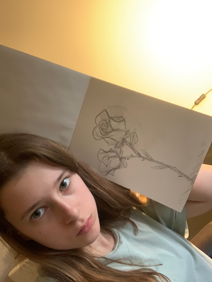 A woman with long brown hair holds a drawing of two roses on a stem. The roses are sketched in a light pencil style. The woman looks directly at the camera with a slightly tilted head. She wears a lig…read more