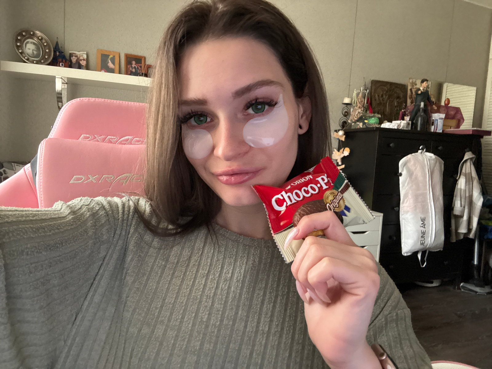 A person with fair skin, long brown hair, and green eyes is holding a package of Choco-Pie by Orion near their face. They have what appear to be eye patches on their face. The person is wearing a ligh…read more