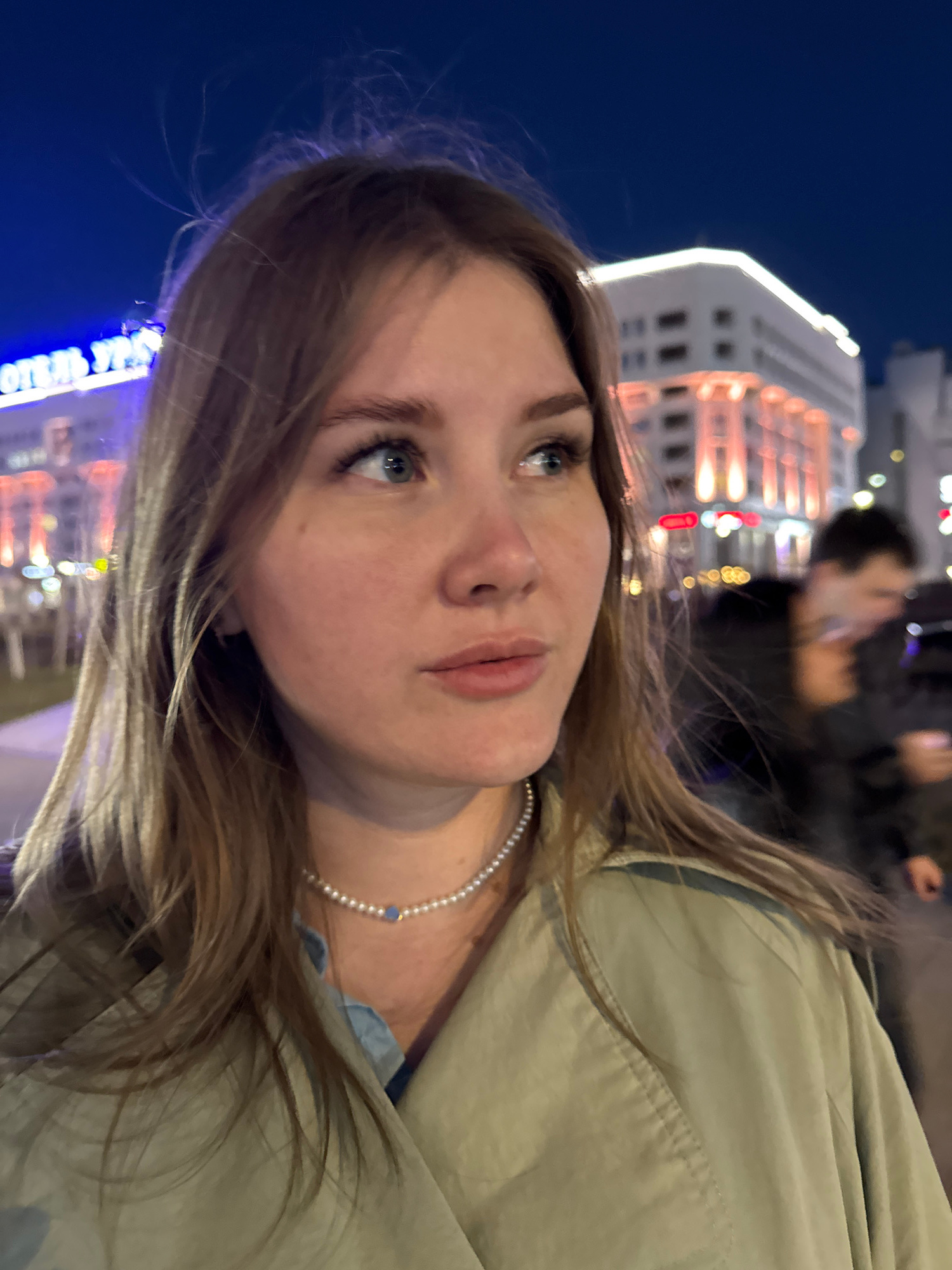The photograph is an off-kilter, eye-level view of a woman with shoulder-length light brown hair and fair skin. She is wearing a light green jacket and a pearl necklace with a blue accent bead. The wo…read more