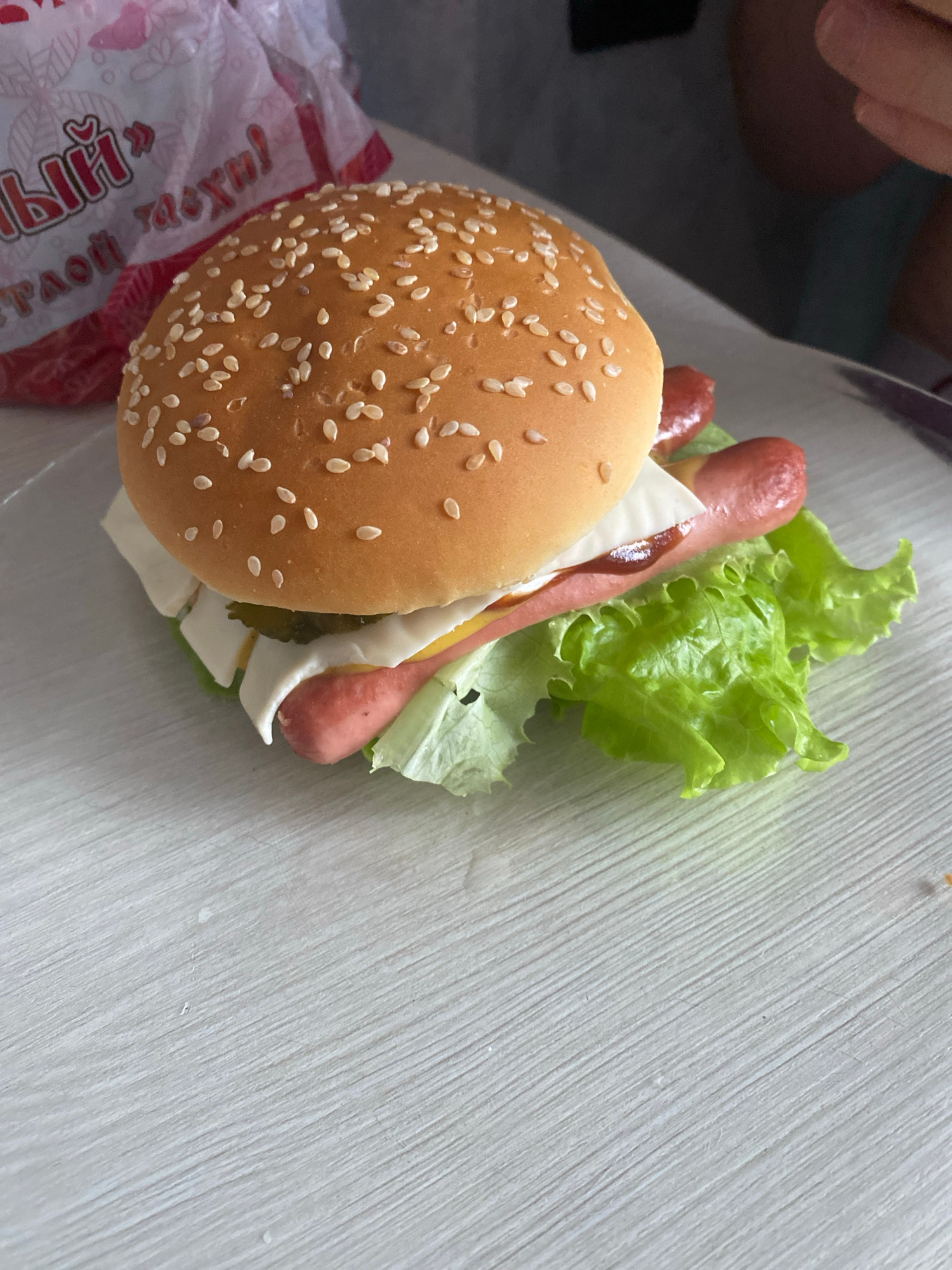 A close-up, overhead shot shows a partially assembled hot dog in a sesame seed bun. The hot dog appears to contain lettuce, cheese, pickles, mustard, and a dark sauce, possibly ketchup or barbecue sau…read more