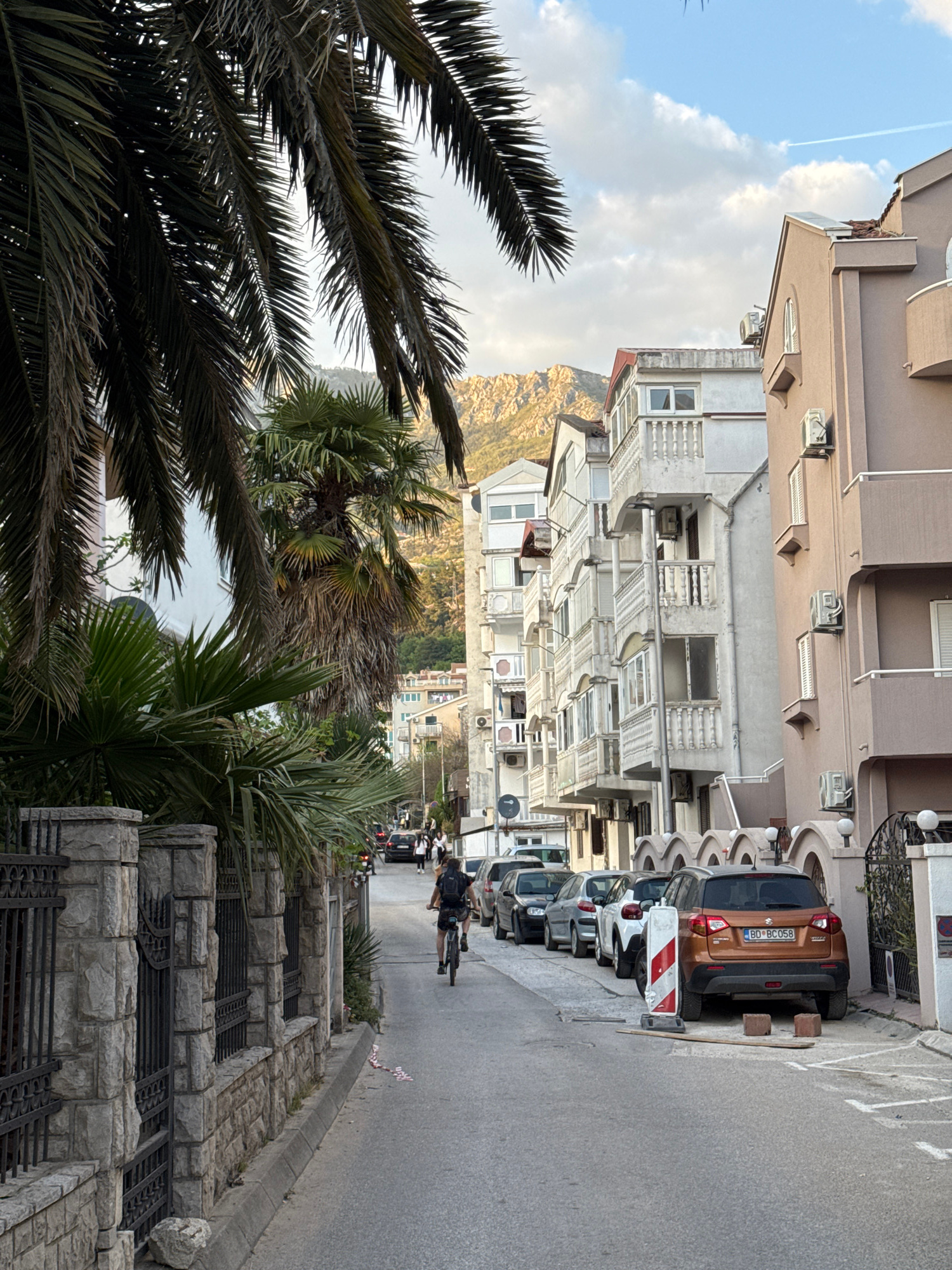 An eye-level medium shot looking up a street in Budva, Montenegro. In the foreground, palm trees obscure parts of the view. A grey stone wall sits on the right, with metalwork details. The street asc…read more