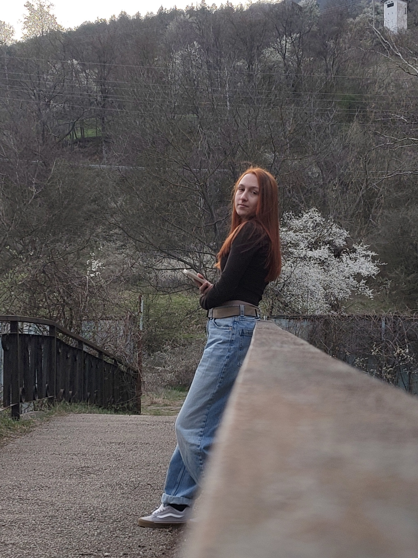 A young, red-haired woman stands on a bridge. She is wearing a brown, long-sleeved shirt, blue jeans, and grey shoes. She holds a phone in her hands. The bridge has a wooden railing. Behind the woman…read more