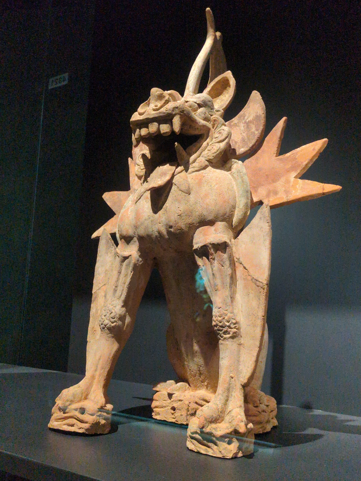 The image depicts a terracotta sculpture of a mythological creature with horns, wings, and a fierce expression. The creature is displayed on a dark gray surface, likely a museum exhibit. The exhibit i…read more