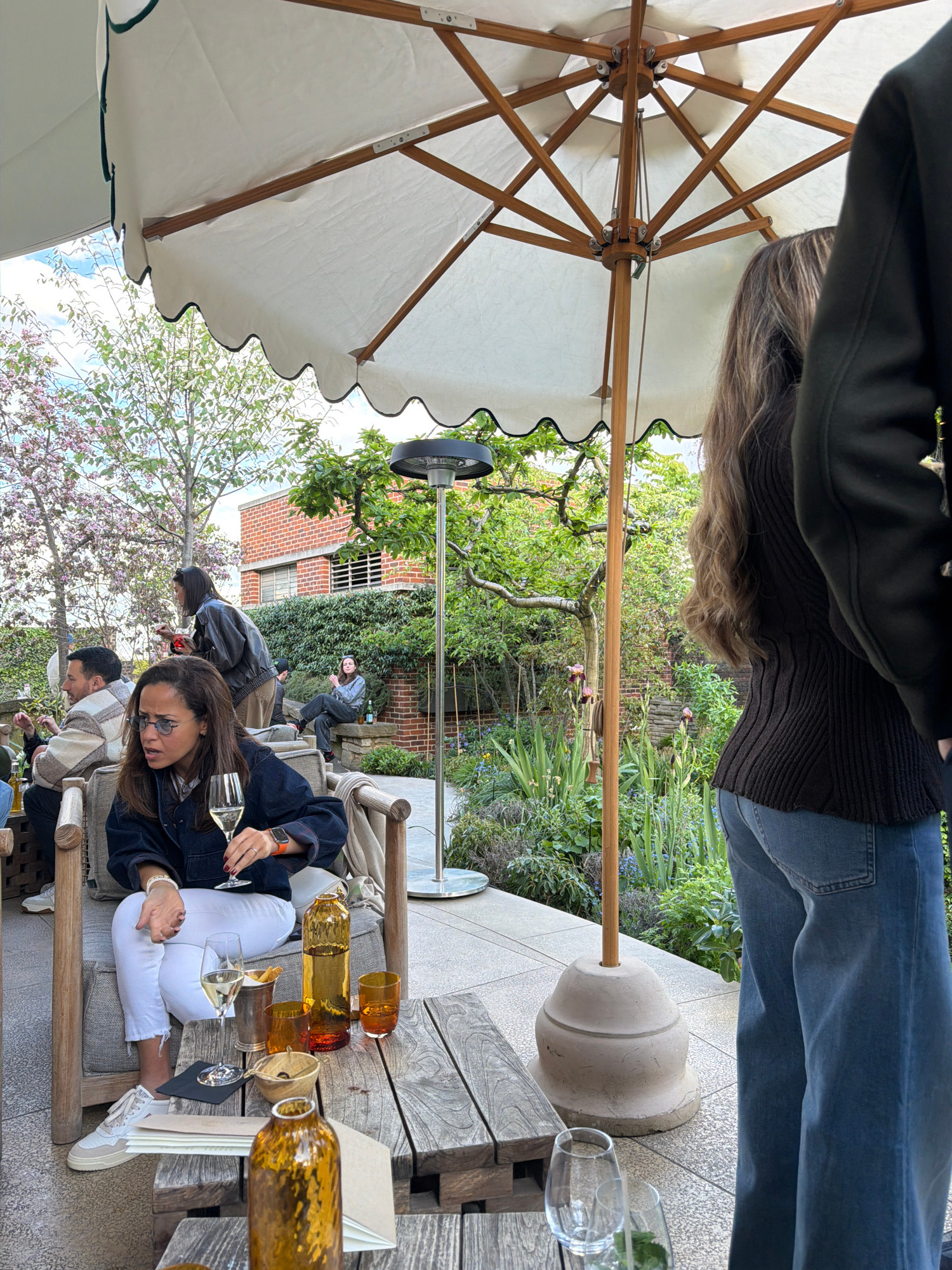 The image captures an outdoor dining scene in London, United Kingdom. Under a large white umbrella with a scalloped edge, patrons are seated at wooden tables. A woman wearing a denim jacket and white…read more