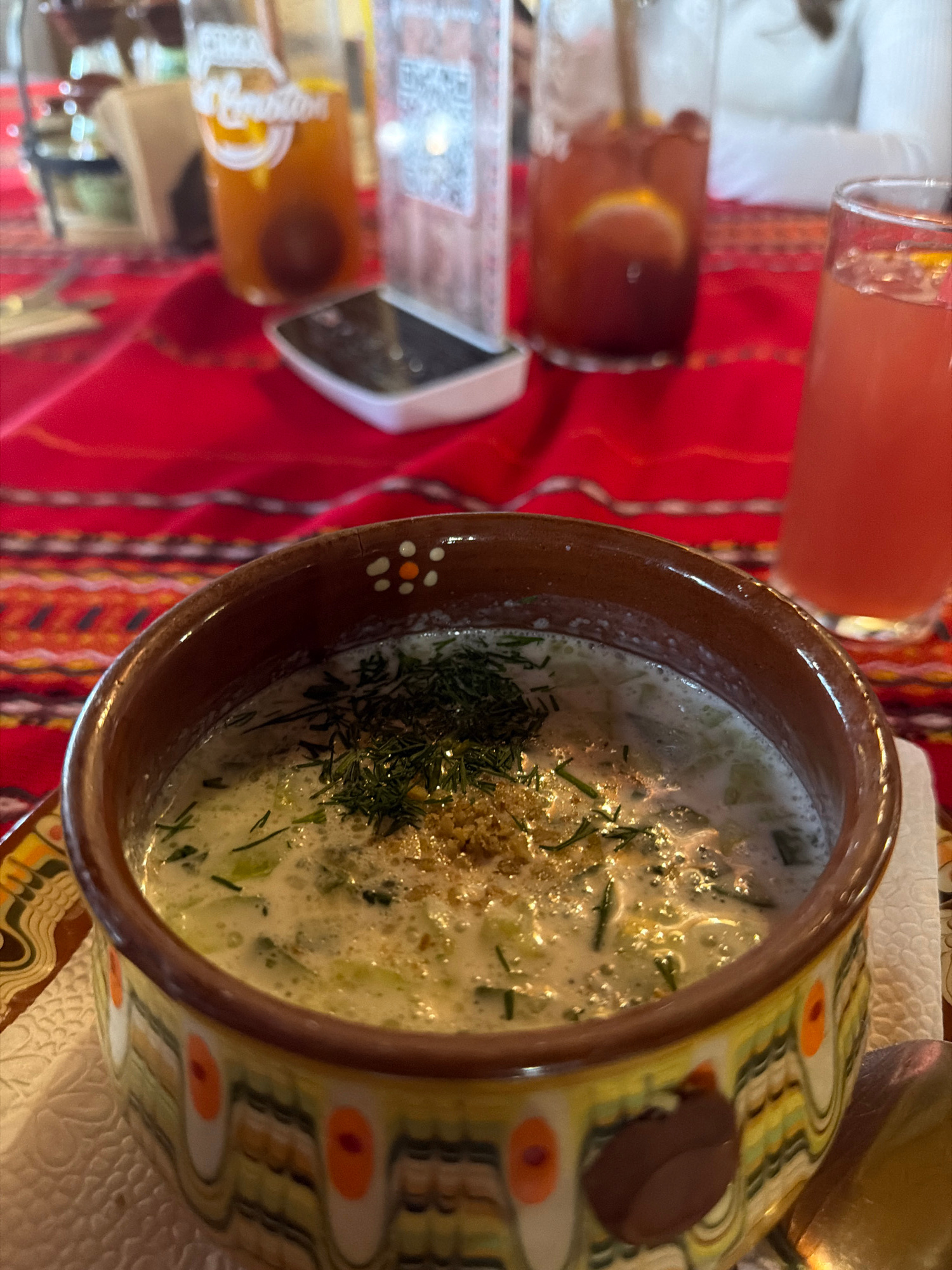 The image presents a bowl of Tarator, a cold cucumber soup, placed on a colorful woven tablecloth. The bowl features a brown rim and a decorative pattern of olive, orange, and brown shapes. Dill and w…read more
