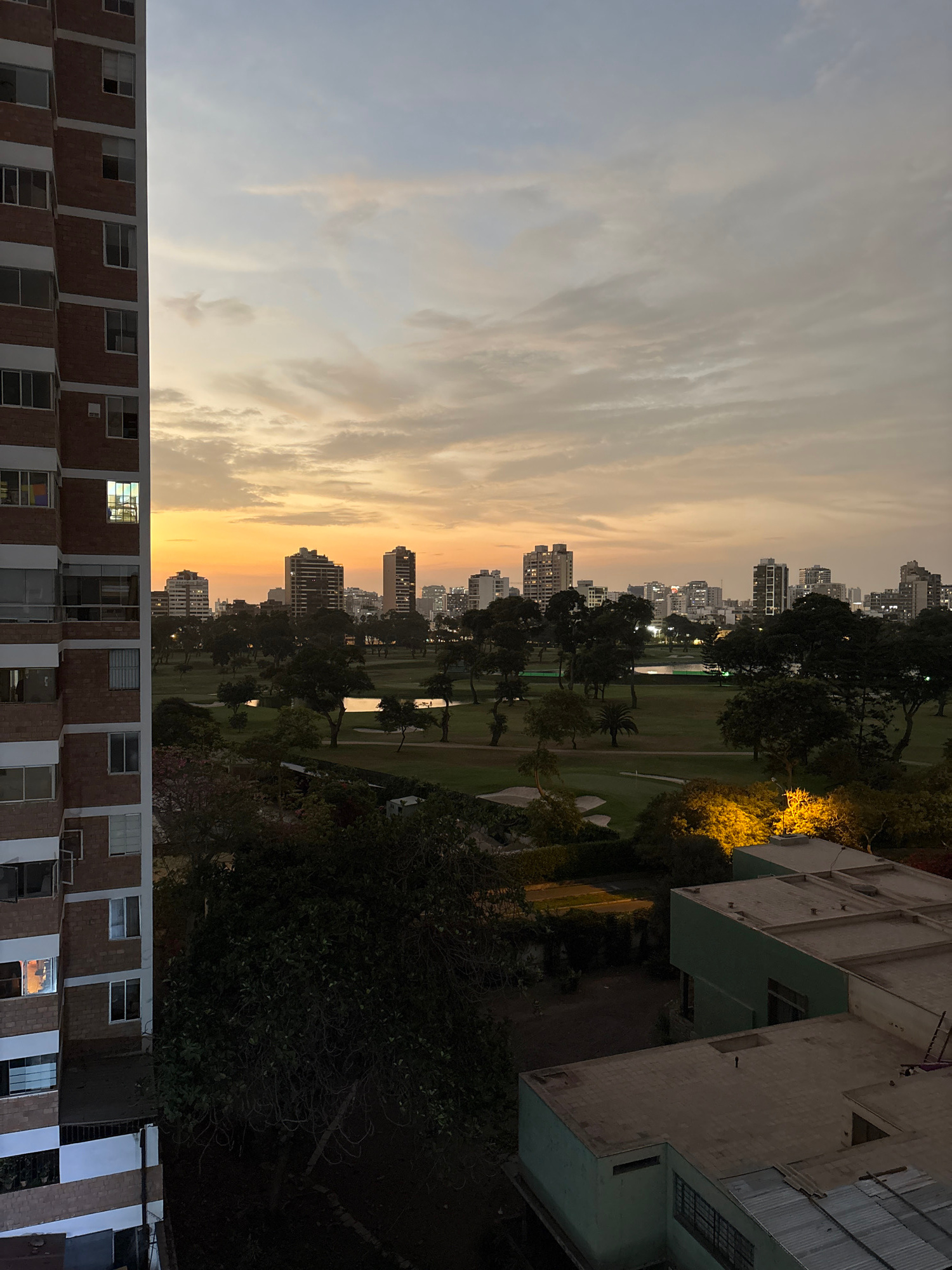 The image shows a cityscape at dusk, likely in San Isidro, Peru. The sky is filled with clouds, colored with yellow and orange hues from the setting sun. Buildings in the foreground, including apartme…read more