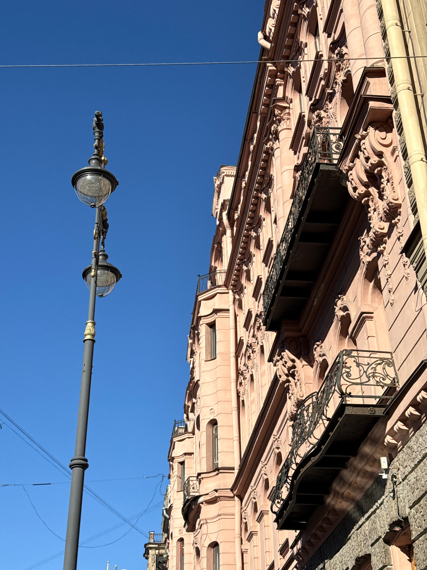 The image depicts a building facade and a lamppost against a clear blue sky. The building features ornate architectural details, including moldings, window frames, and decorative wrought-iron balconie…read more