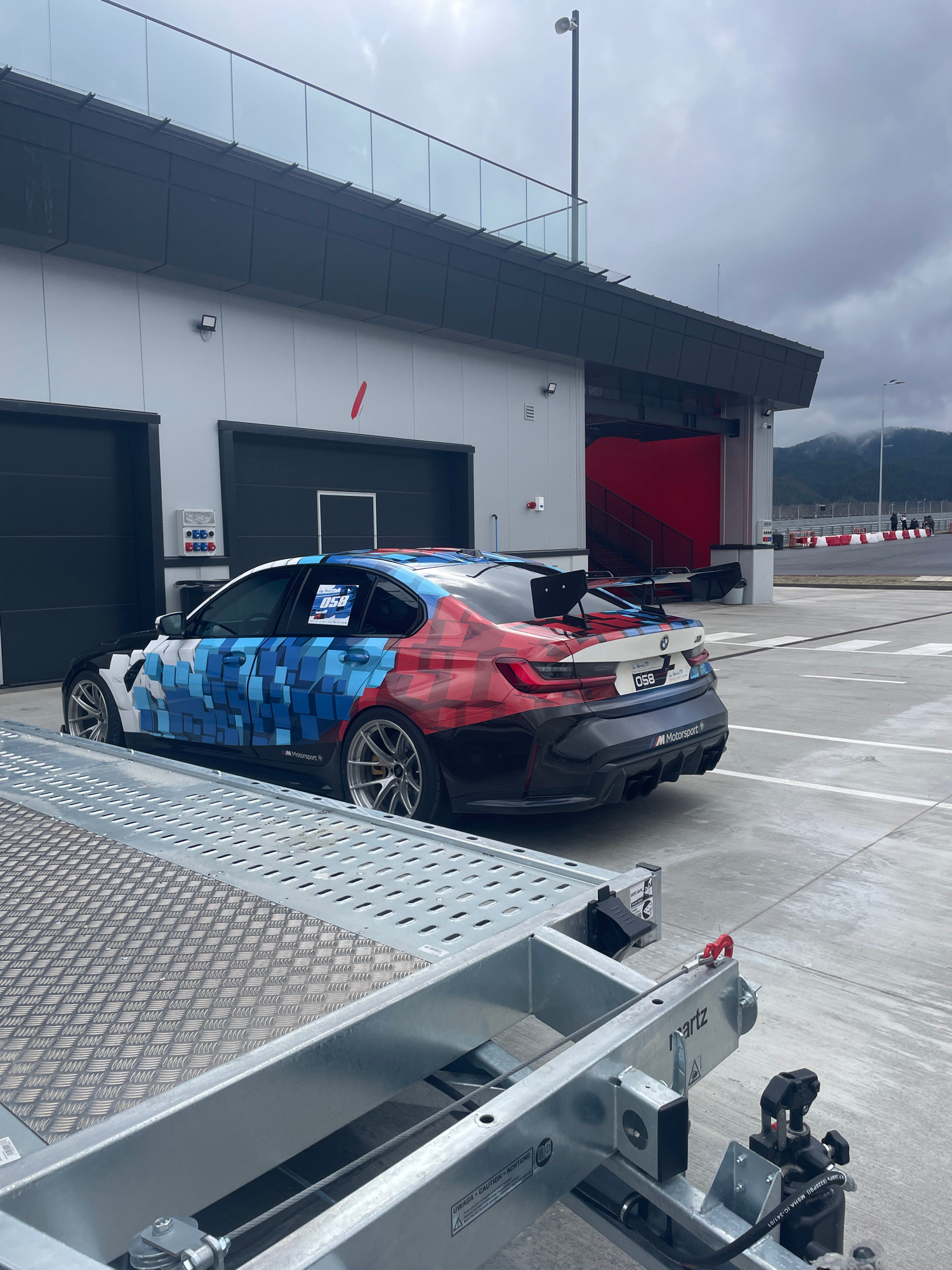 The image shows a BMW M Motorsport race car, bearing the number 058, parked on a metallic ramp, likely being loaded or unloaded. The car features a distinctive red, white, and blue cubic design on its…read more