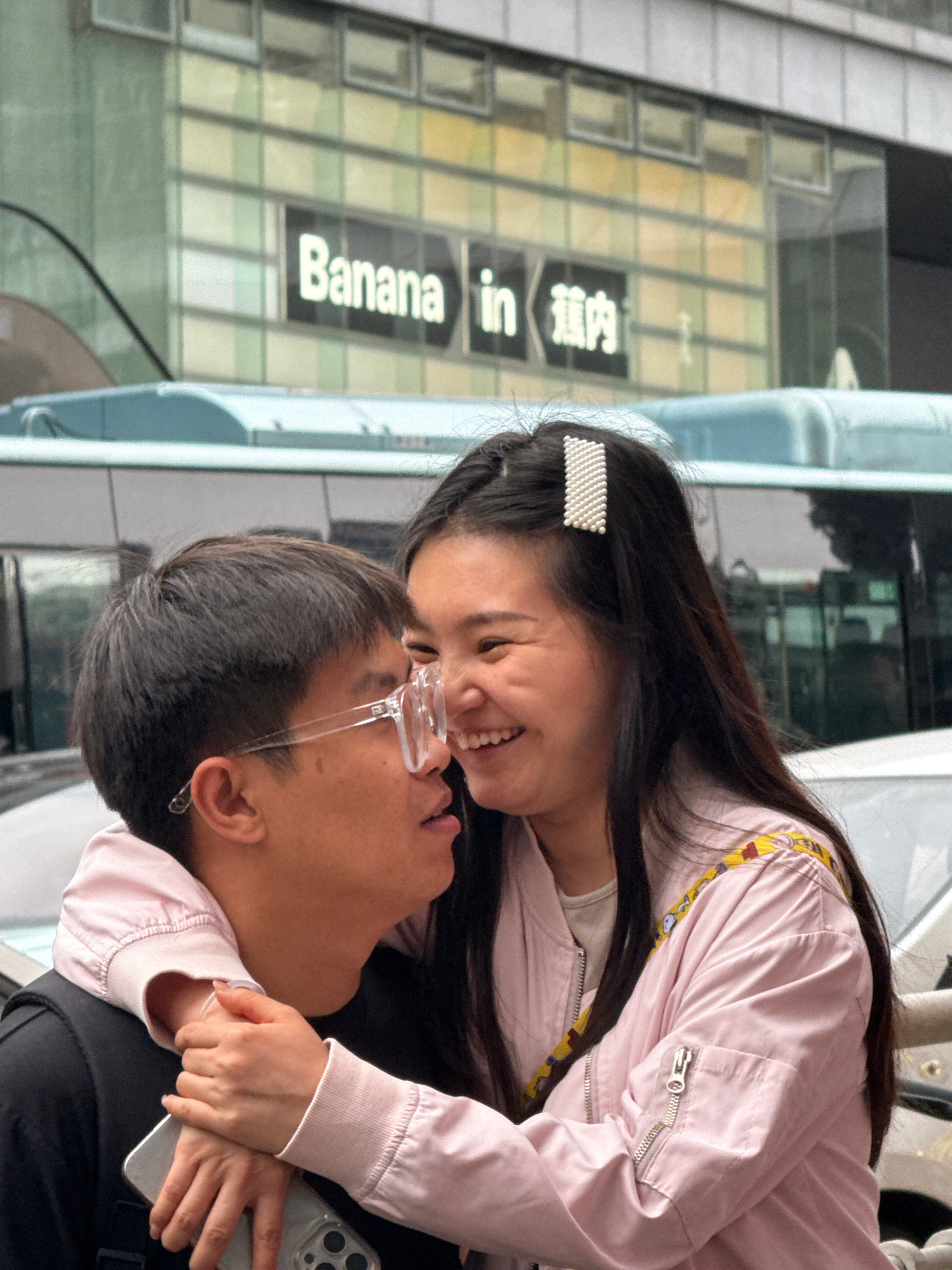 A woman with long dark hair, adorned with a pearl barrette, smiles while hugging a man wearing clear-framed glasses and a light pink bomber jacket over a black shirt. She has her arms wrapped around h…read more
