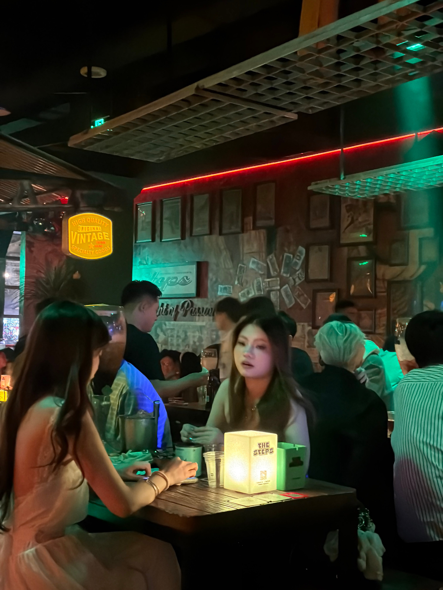 This image depicts a dimly lit indoor bar scene with multiple people. The location is identified as being in the Chongqing High-tech Zone, China, based on signage visible. A group of patrons are seat…read more