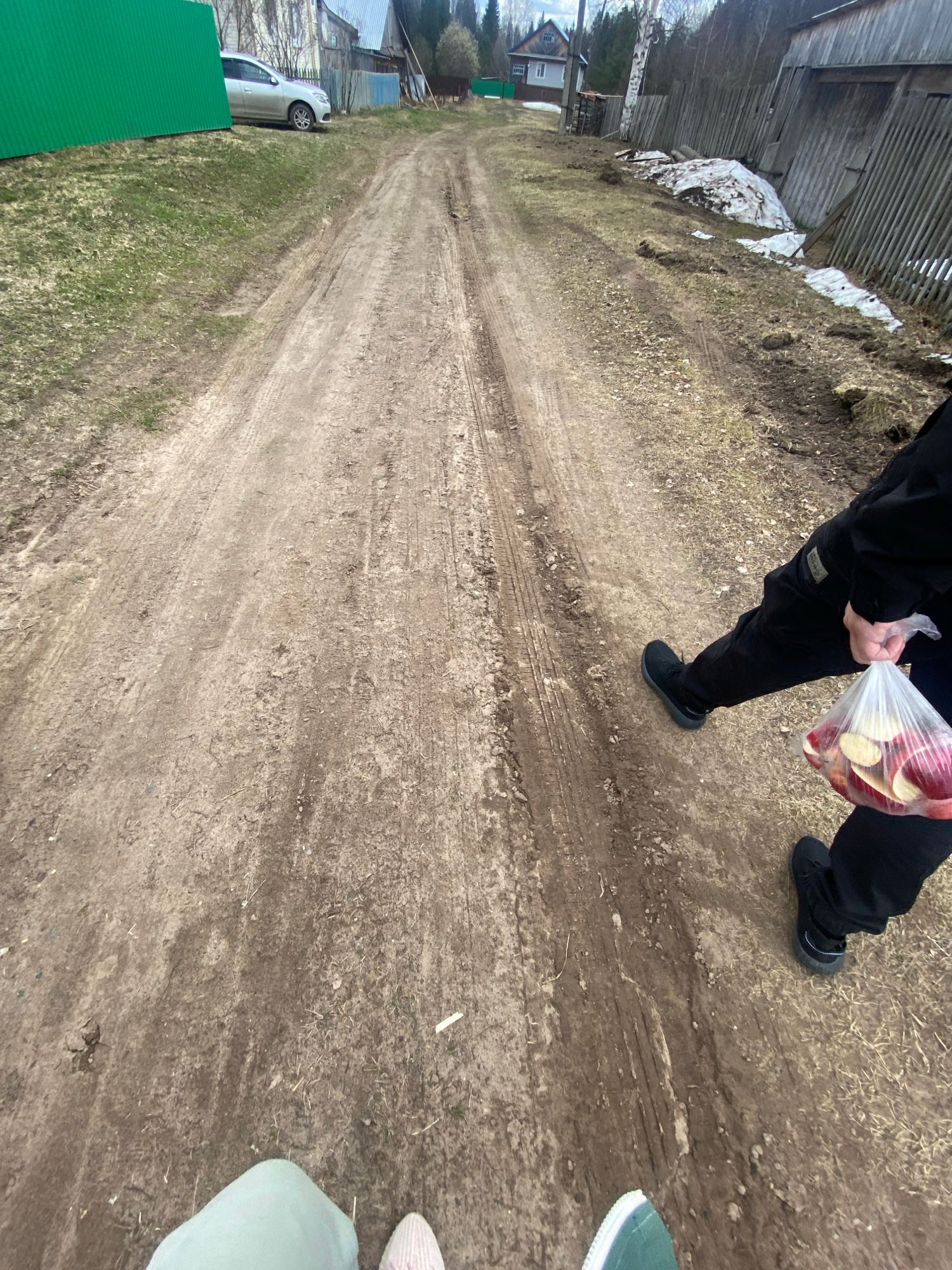 The image, captured from a high-angle perspective, depicts a rural dirt road on an overcast day, likely during early spring or late autumn given the presence of melting snow and bare trees. Two indiv…read more