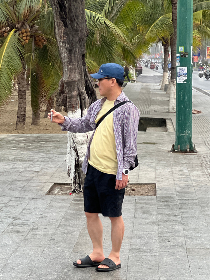 The image depicts an adult male standing on a grey tiled sidewalk in Nha Trang, Vietnam, consistent with a coastal promenade. The man, of East Asian descent, wears a blue baseball cap, eyeglasses, a l…read more