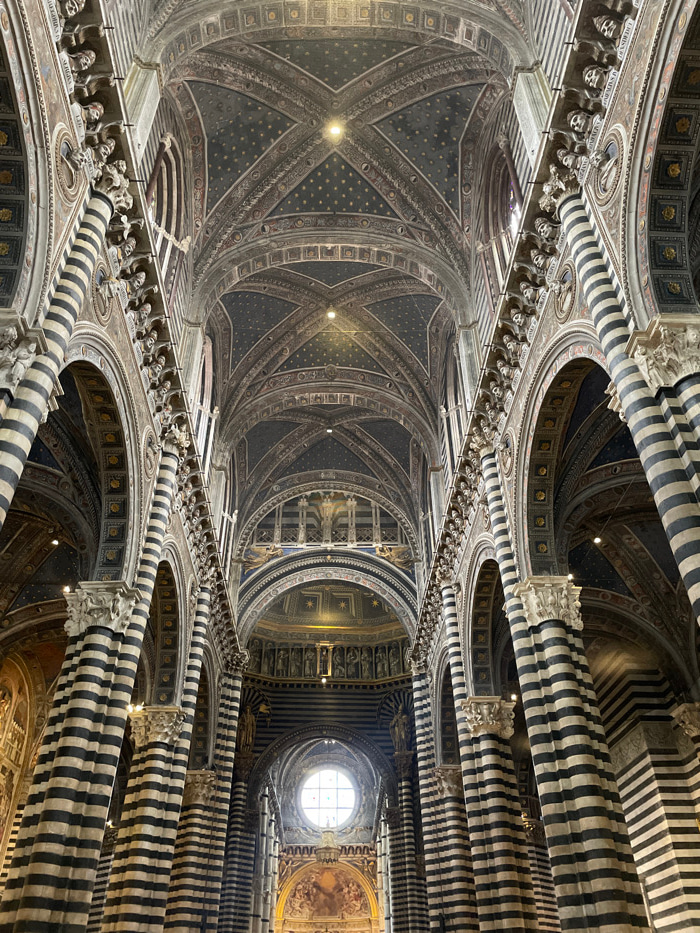 The image displays the interior of the Siena Cathedral (Duomo di Siena) in Siena, Italy, specifically the nave, captured from a low angle looking towards the distant apse. The scene is characterized b…read more
