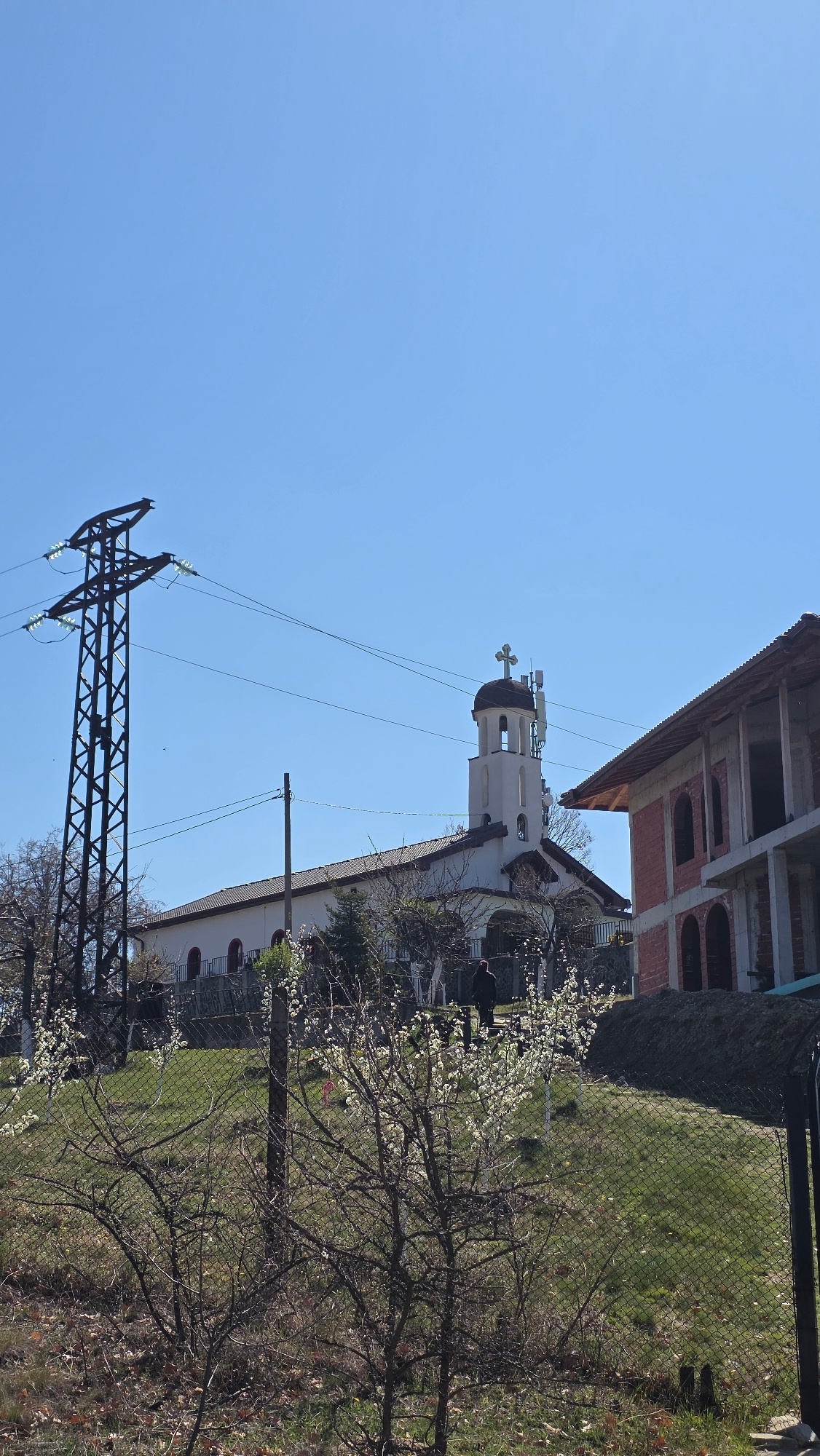 The image shows a scene in Marulevo, Bulgaria, featuring a church with a white tower and cross, near an unfinished brick building, and an electricity pylon. Overhead power lines connect the church and…read more