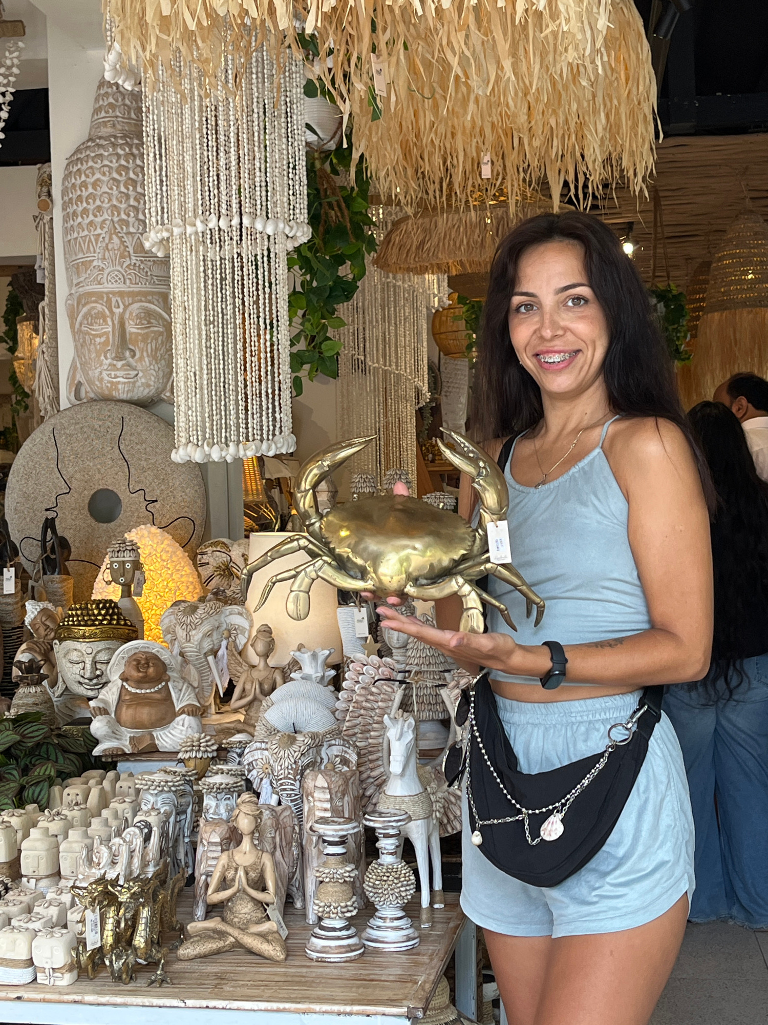 A smiling woman with dark hair and braces, wearing a light blue sleeveless top and matching shorts, is captured indoors in what appears to be a busy market or home decor shop. She holds up a large, po…read more