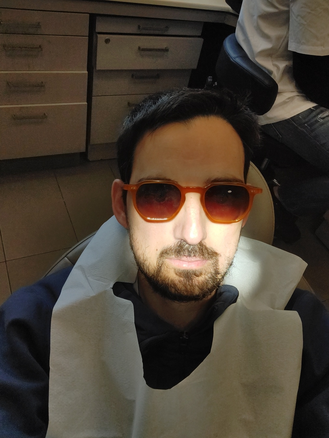 A bearded man wearing orange sunglasses is lying in what appears to be a dental or medical chair covered with a white paper sheet. The background shows a cabinet with several drawers, suggesting a cliβ¦read more