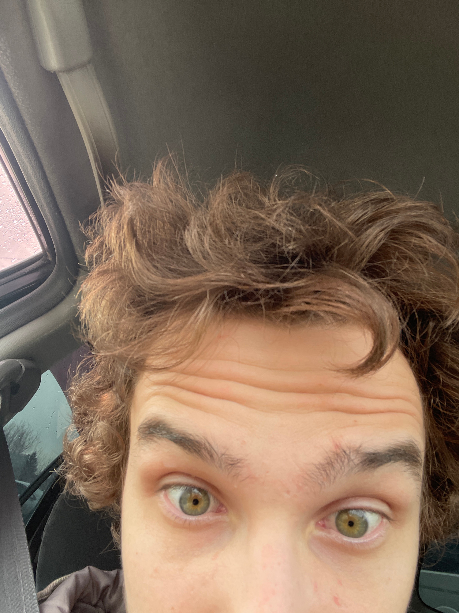 A selfie photograph taken from a close and high angle depicts a person with brown hair, green eyes, and forehead wrinkles. The setting appears to be inside a vehicle, evidenced by a car ceiling and a…read more