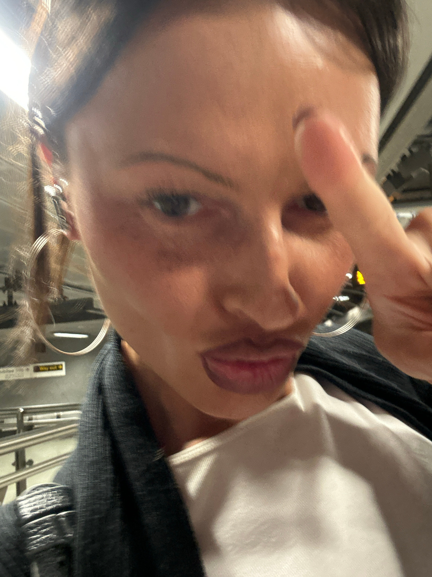 A close-up selfie captures a person, likely female, from a low, upward-looking angle, with the image rotated 90 degrees counter-clockwise. The subject has dark hair, visible on the left, and a warm sk…read more