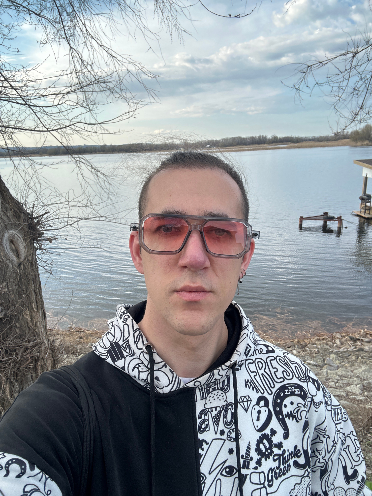 A fair-skinned male with long hair pulled back into a bun and pink-tinted sunglasses poses for a selfie. He is wearing a black hoodie with white, doodle-style patterned trim around the hood and should…read more