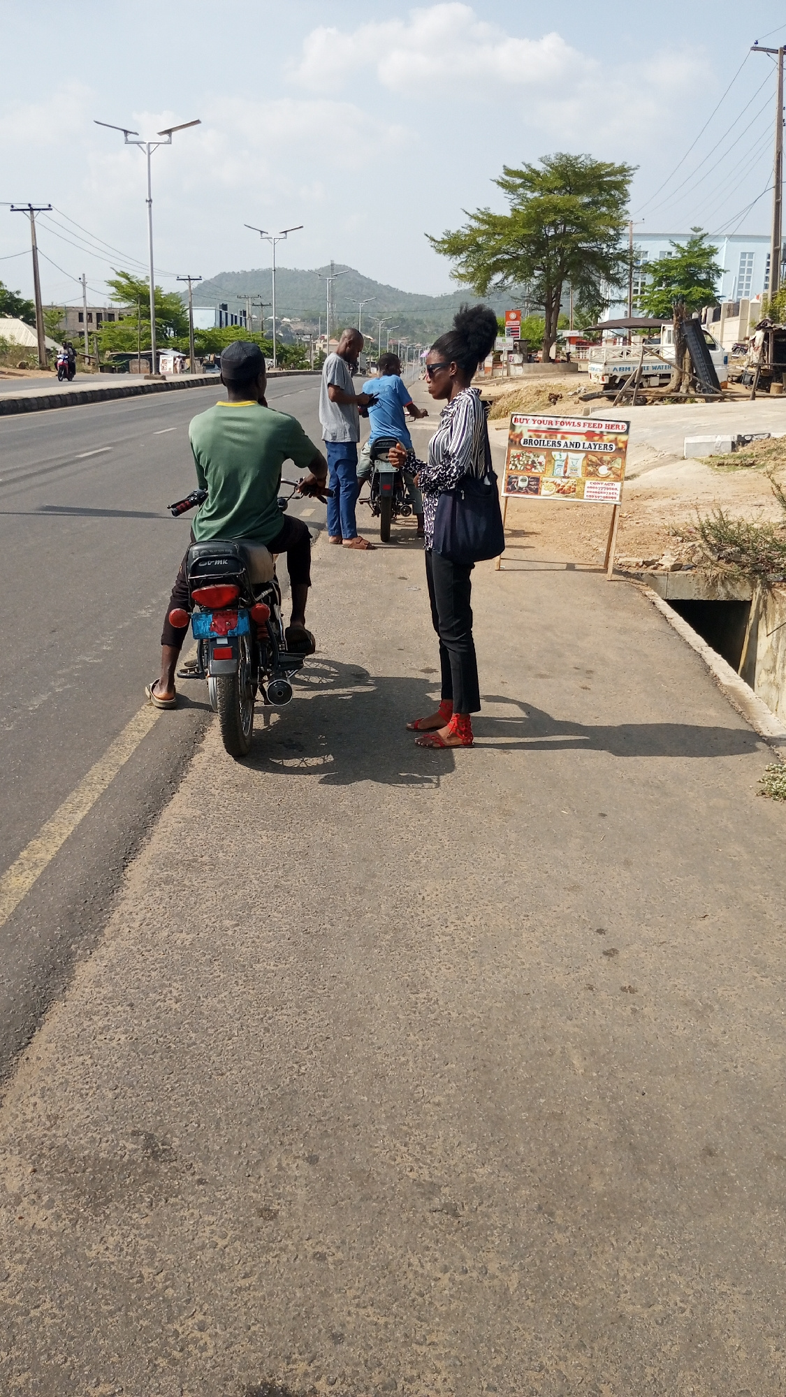 The scene is in Adankolo, Nigeria. A man in a green shirt sits on a motorcycle parked on the sidewalk next to a road. A woman in a striped shirt and black pants stands facing him, seemingly engaged in…read more