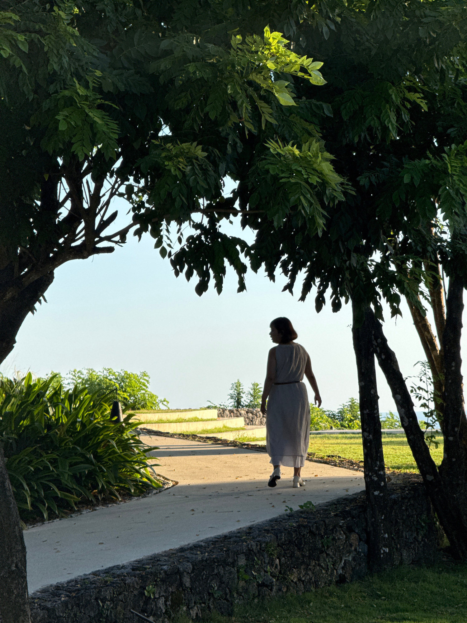 A woman in a light-colored dress is walking along a paved path in a garden in Kuta Selatan, Indonesia. The path is lined on one side by a low stone wall, and on the other side by a manicured garden wi…read more