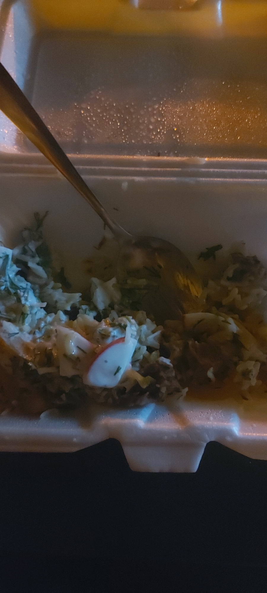A close-up shot shows a half-eaten meal in a white styrofoam container, possibly taken outdoors at night. The meal appears to be rice with meat and what might be sliced radishes or similar vegetables.…read more