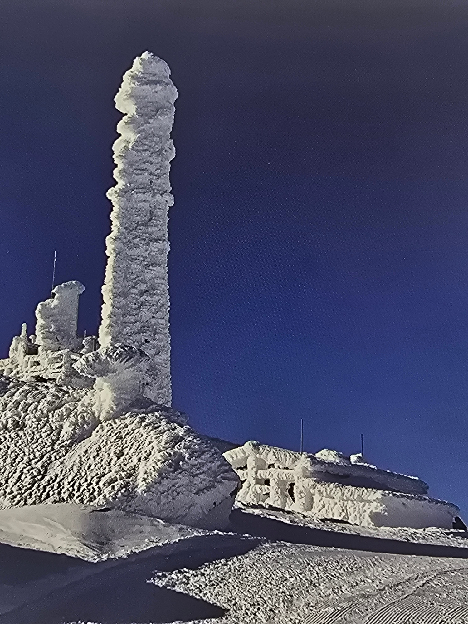 The image displays a rugged, high-altitude winter scene dominated by structures heavily encrusted with rime ice against a deep, clear blue sky. The primary subject is a tall, slender mast or tower, co…read more