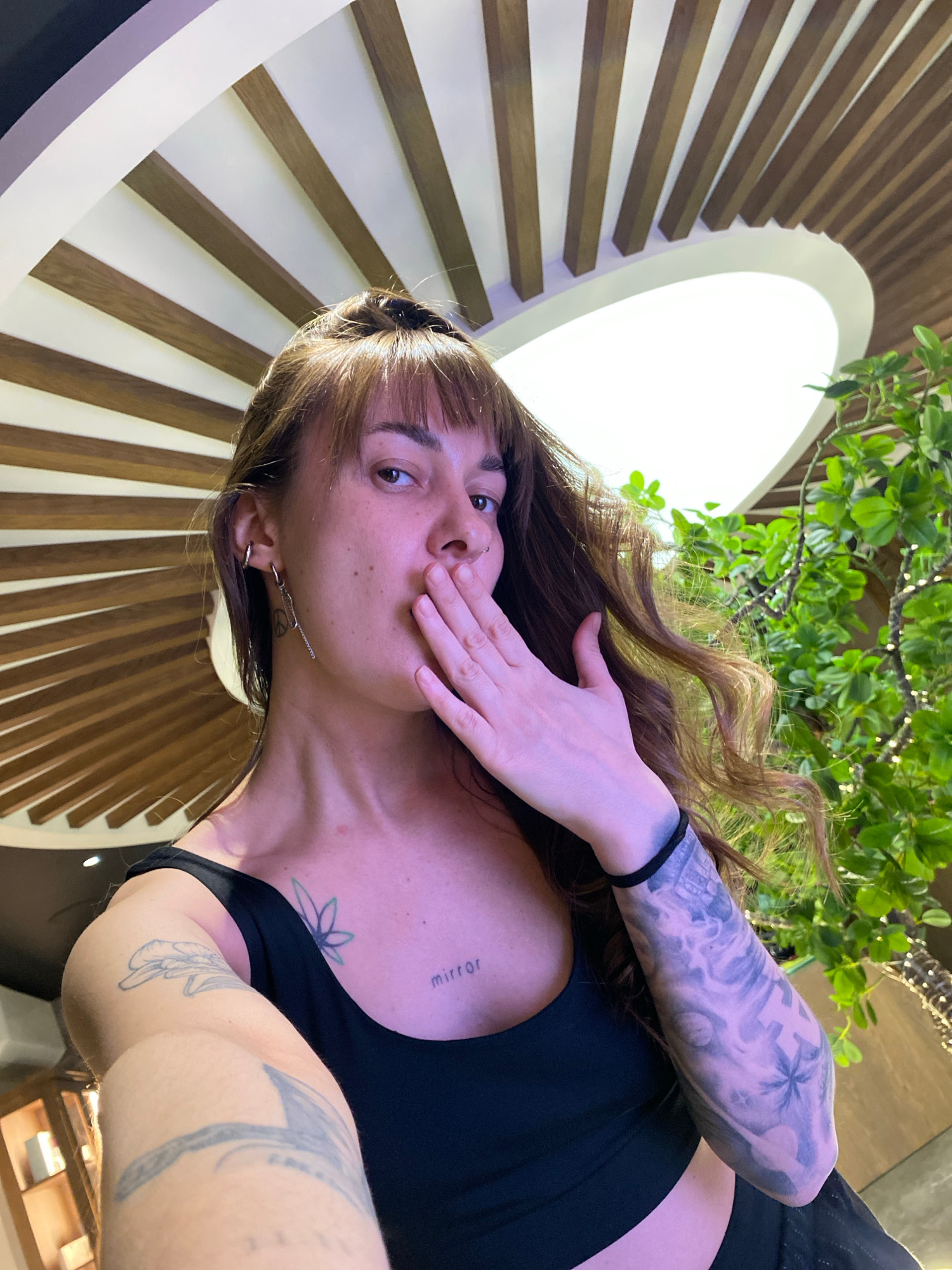 A person with brown hair and bangs is shown in a low-angle selfie, partially covering their mouth with their hand. They are wearing a black top and have tattoos on their arms and chest. The background…read more