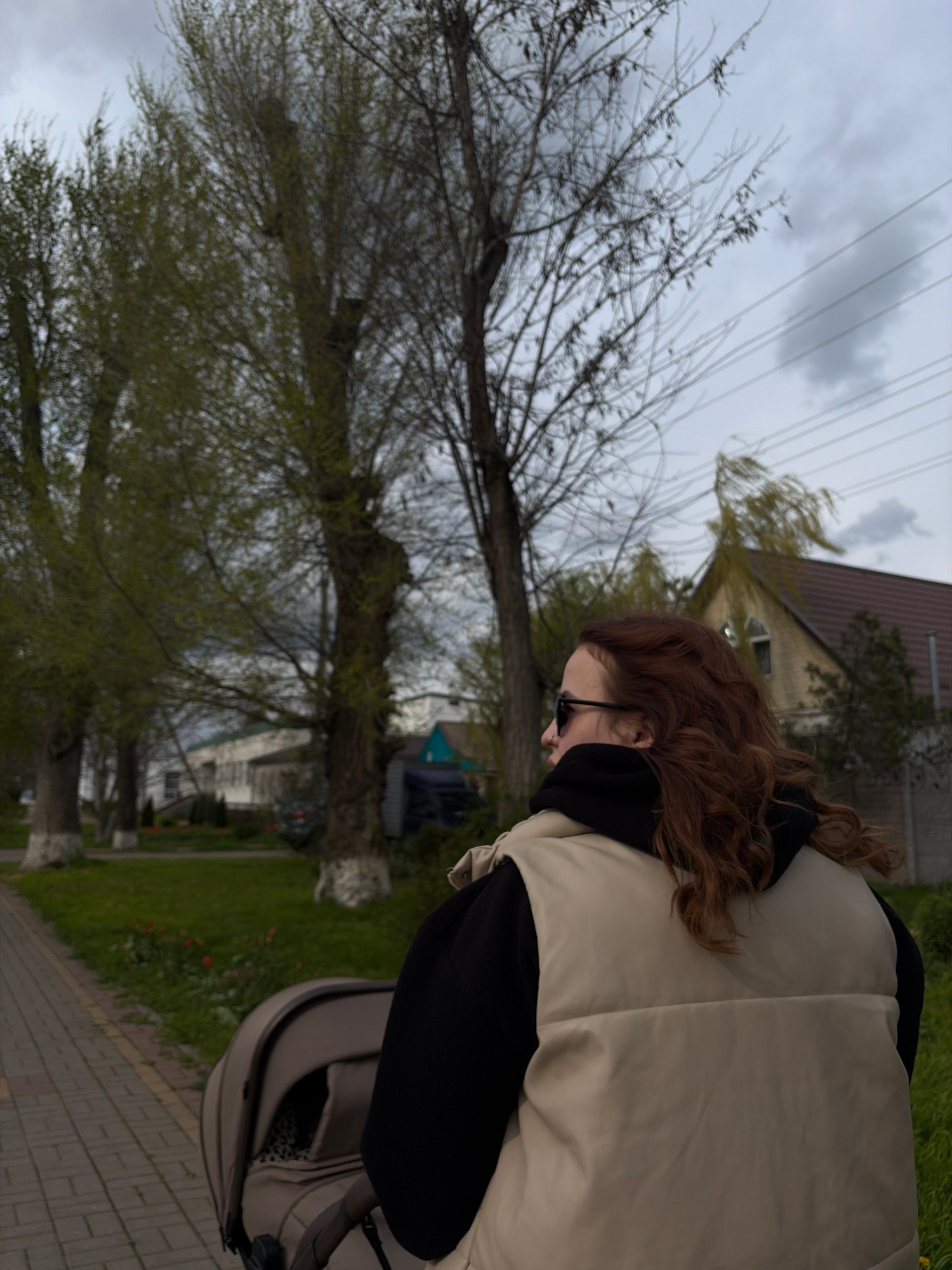 A slightly blurred, sideways photograph shows a woman pushing a stroller on a sidewalk in Novopokrovskaya, Russia. The woman has reddish-brown curly hair and is wearing glasses, a black hooded top, an…read more