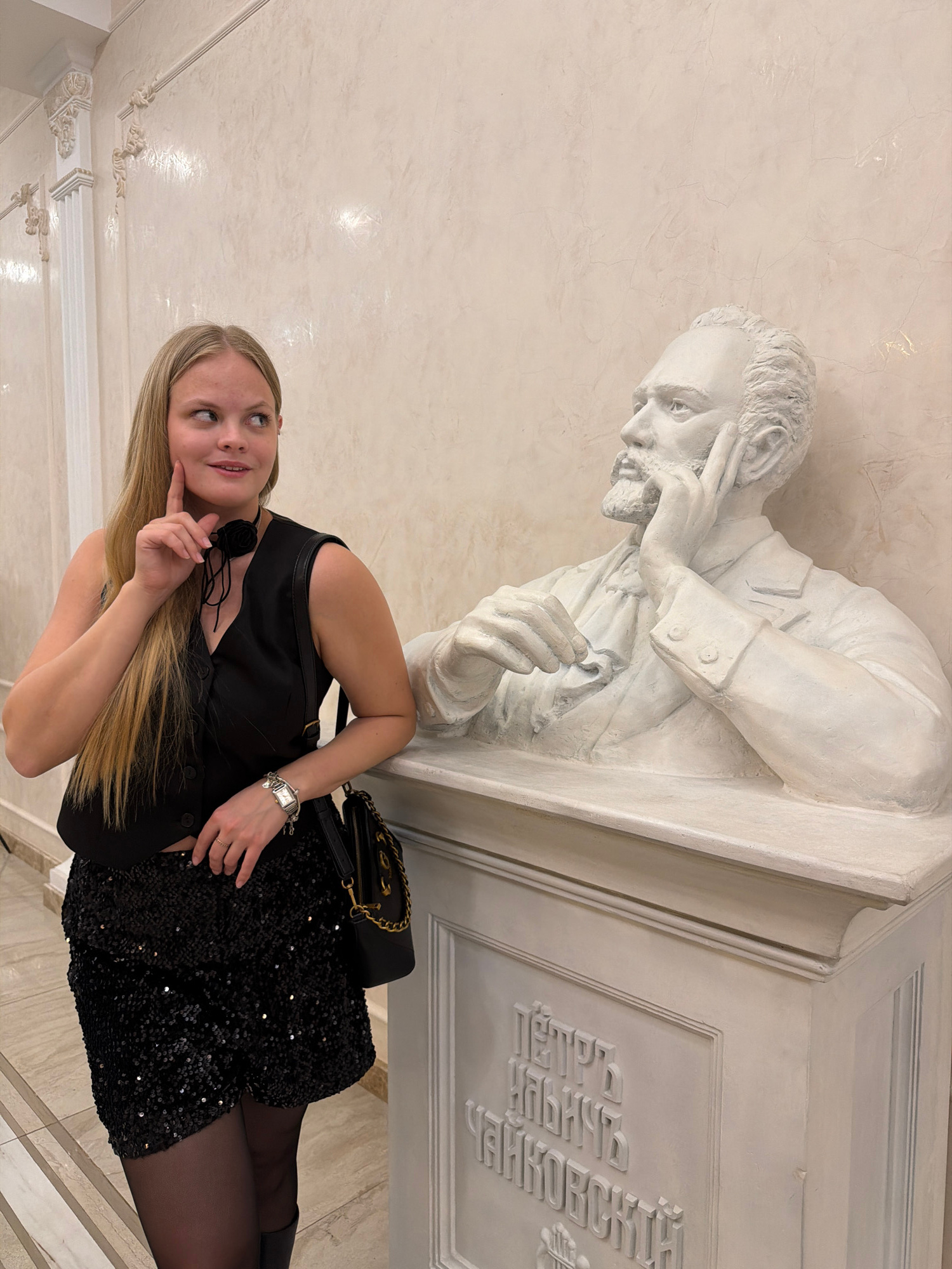 A young woman with blonde hair stands next to a white bust sculpture in what appears to be an interior space. The woman is wearing a black outfit consisting of a vest, a sequined skirt, and dark tight…read more