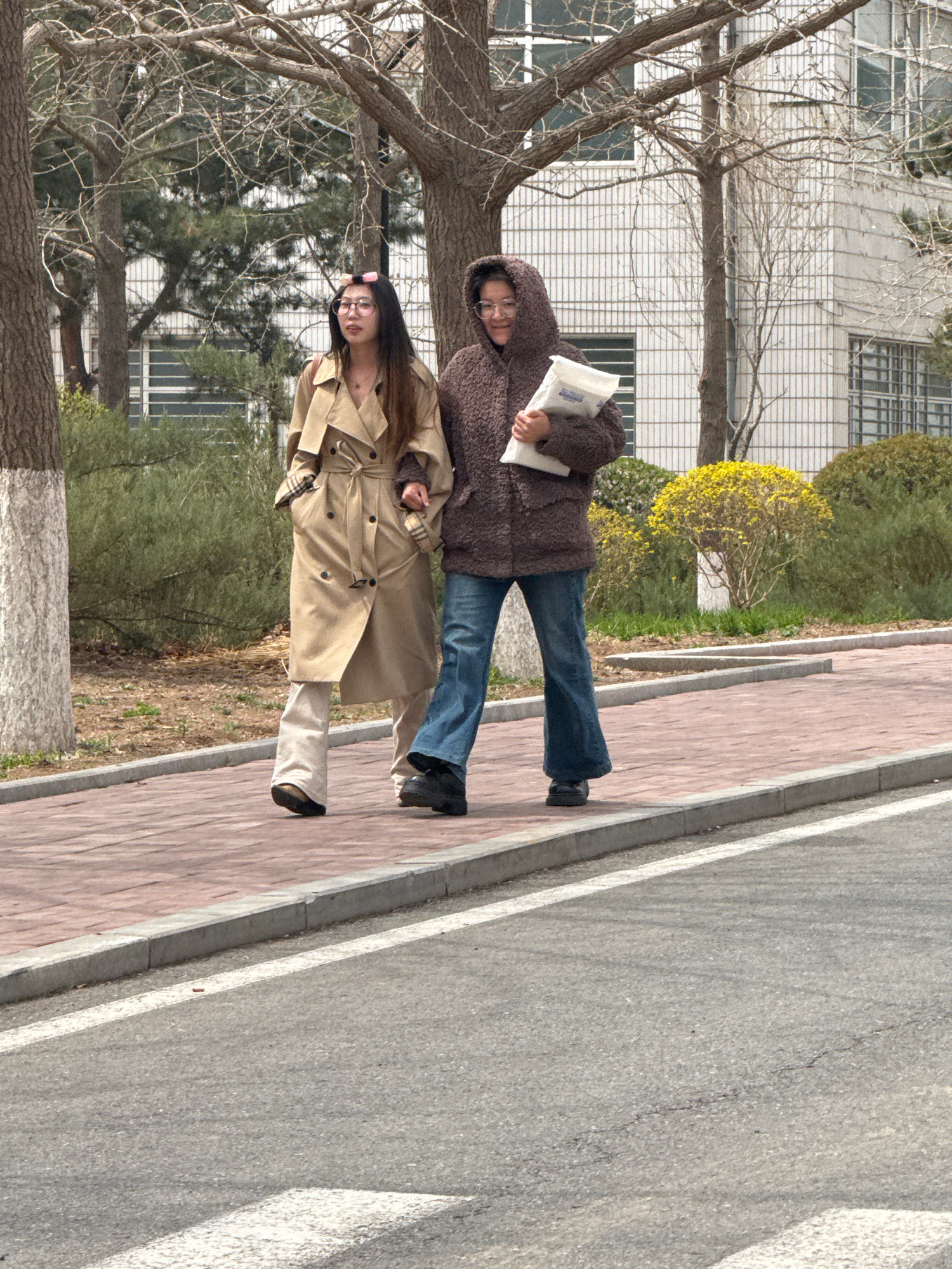 A brightly lit, full-length outdoor shot, originally rotated 90 degrees clockwise, captures two individuals walking on a paved sidewalk in Zhongtun, China. The scene depicts a brick-patterned sidewal…read more