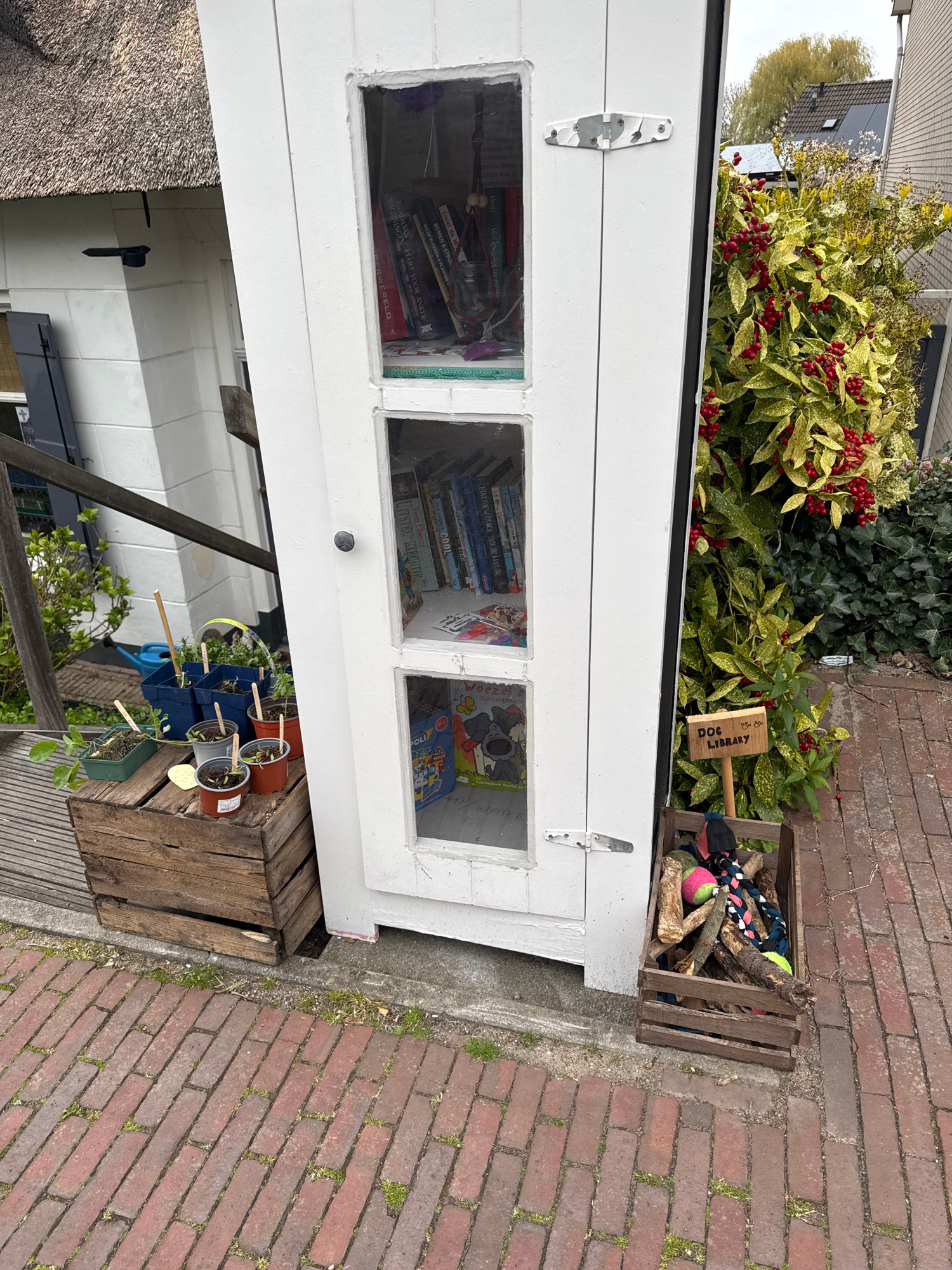 The image shows a white cabinet standing outdoors, serving as a small library. The location is suggested by the books written in Dutch and the presence of a brick-paved street. A wooden sign labeled "…read more