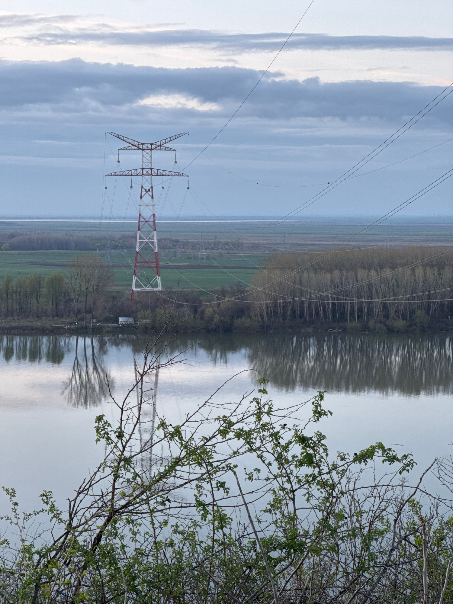 The image shows a landscape with a mix of natural and industrial elements. A high-voltage power line tower stands prominently in the center-left of the frame, painted with red and white stripes. Power…read more