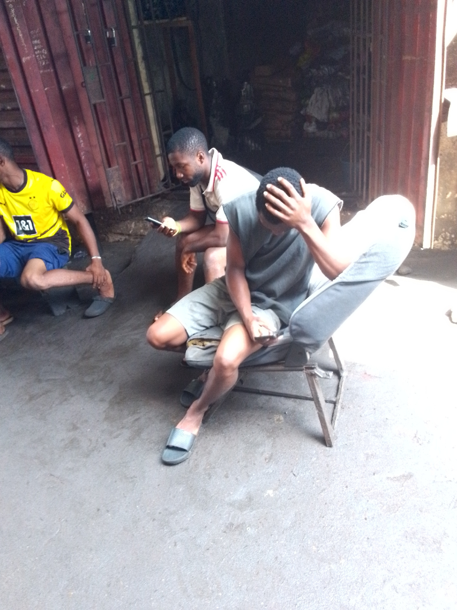 This daytime image features three men resting in what appears to be a semi-outdoor commercial or market setting. The ground is a light grey concrete or paved surface, with direct sunlight illuminating…read more