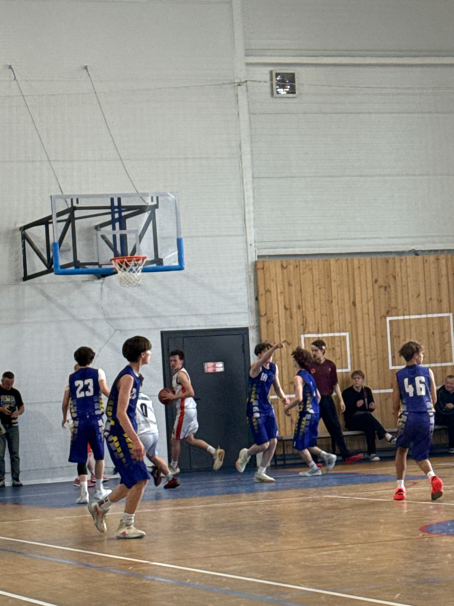 The image shows a basketball game being played in an indoor gymnasium. The players are wearing basketball jerseys with numbers on them. A basketball hoop is visible on the left side of the frame. Spec…read more
