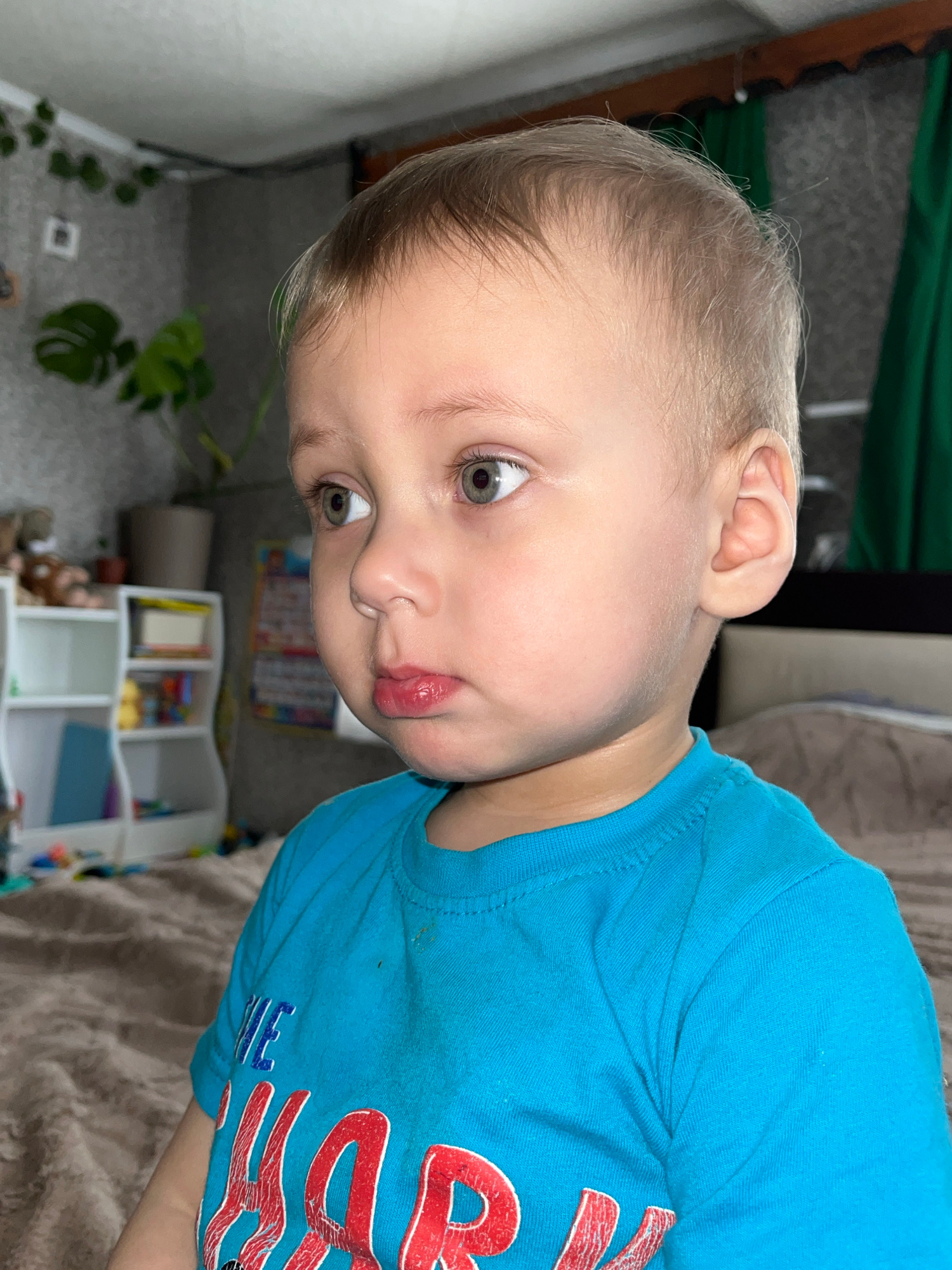 A close-up, slightly rotated shot shows a young child with blond hair and fair skin wearing a bright blue t-shirt with red and white graphics. The child's face is in focus, with light-colored eyes loo…read more
