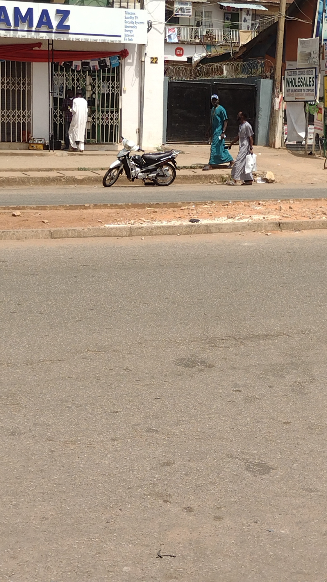 Here is a description of the image: The image shows a street scene, likely taken in Jos, Nigeria, indicated by the business signs. A wide asphalt road occupies much of the frame. The roadside include…read more