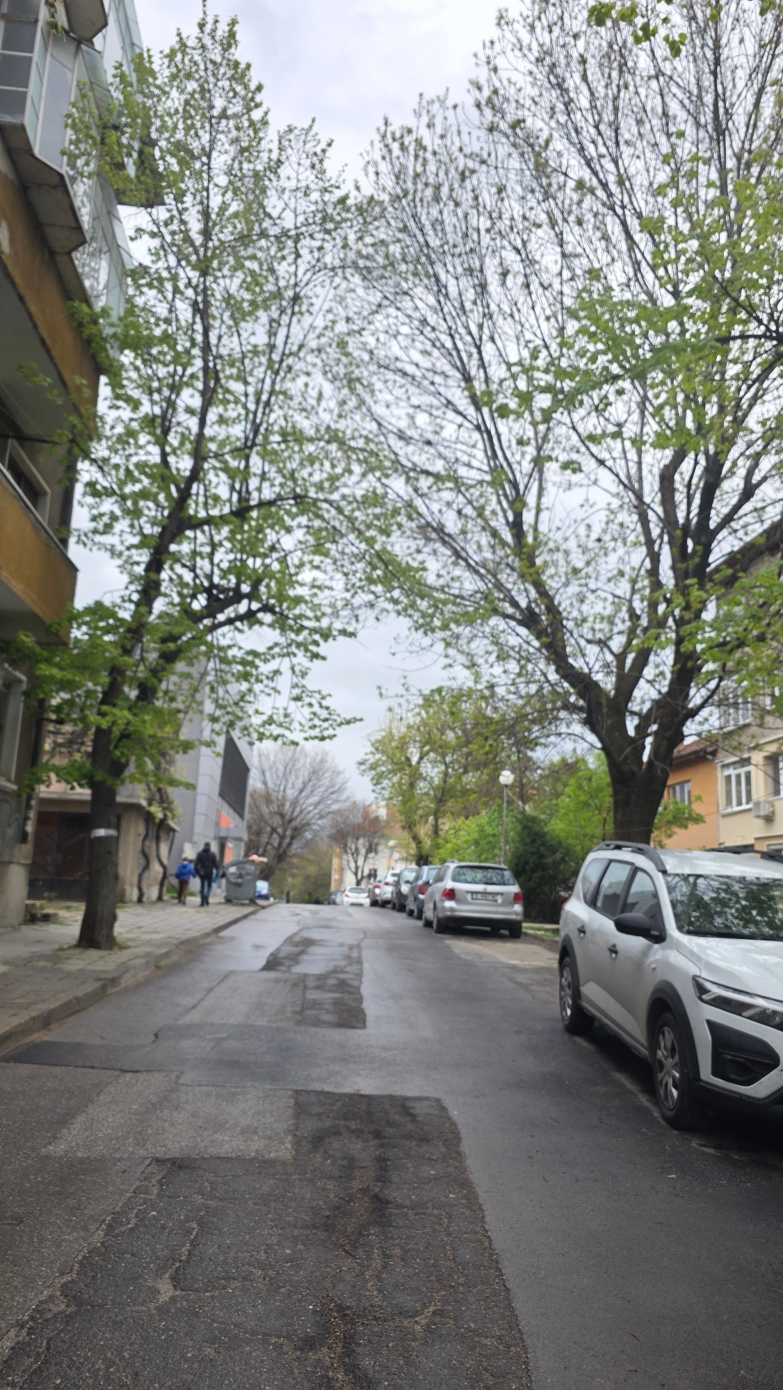 An eye-level, outdoor, color photograph depicts a city street. A white car is parked at the top right, along with other cars in the street. Tall trees with green leaves are on both sides of the street…read more