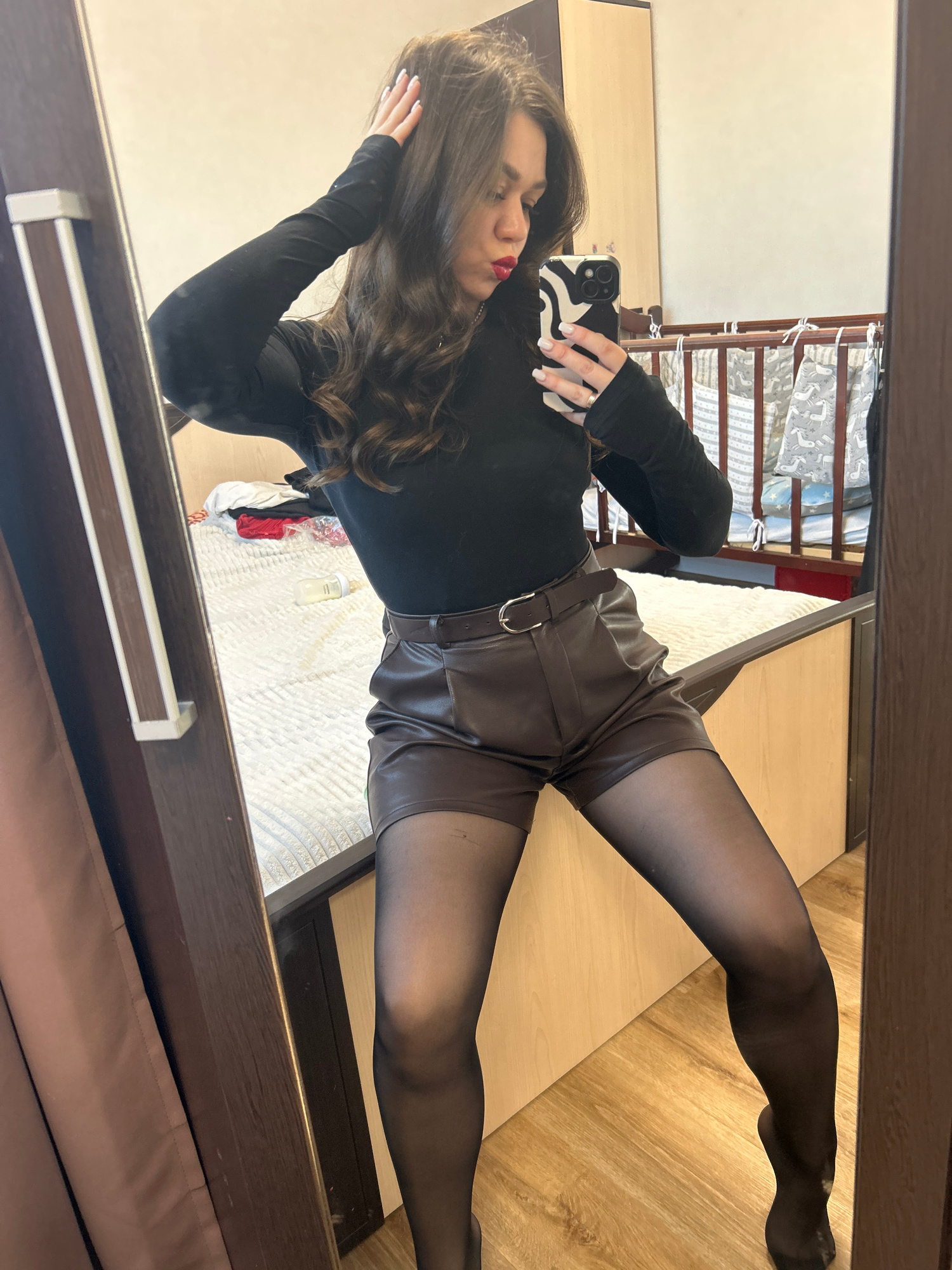 A young woman takes a mirror selfie in what appears to be a room. She is wearing a long-sleeved black top, brown leather shorts with a belt, and black tights. She holds a smartphone with a zebra-strip…read more