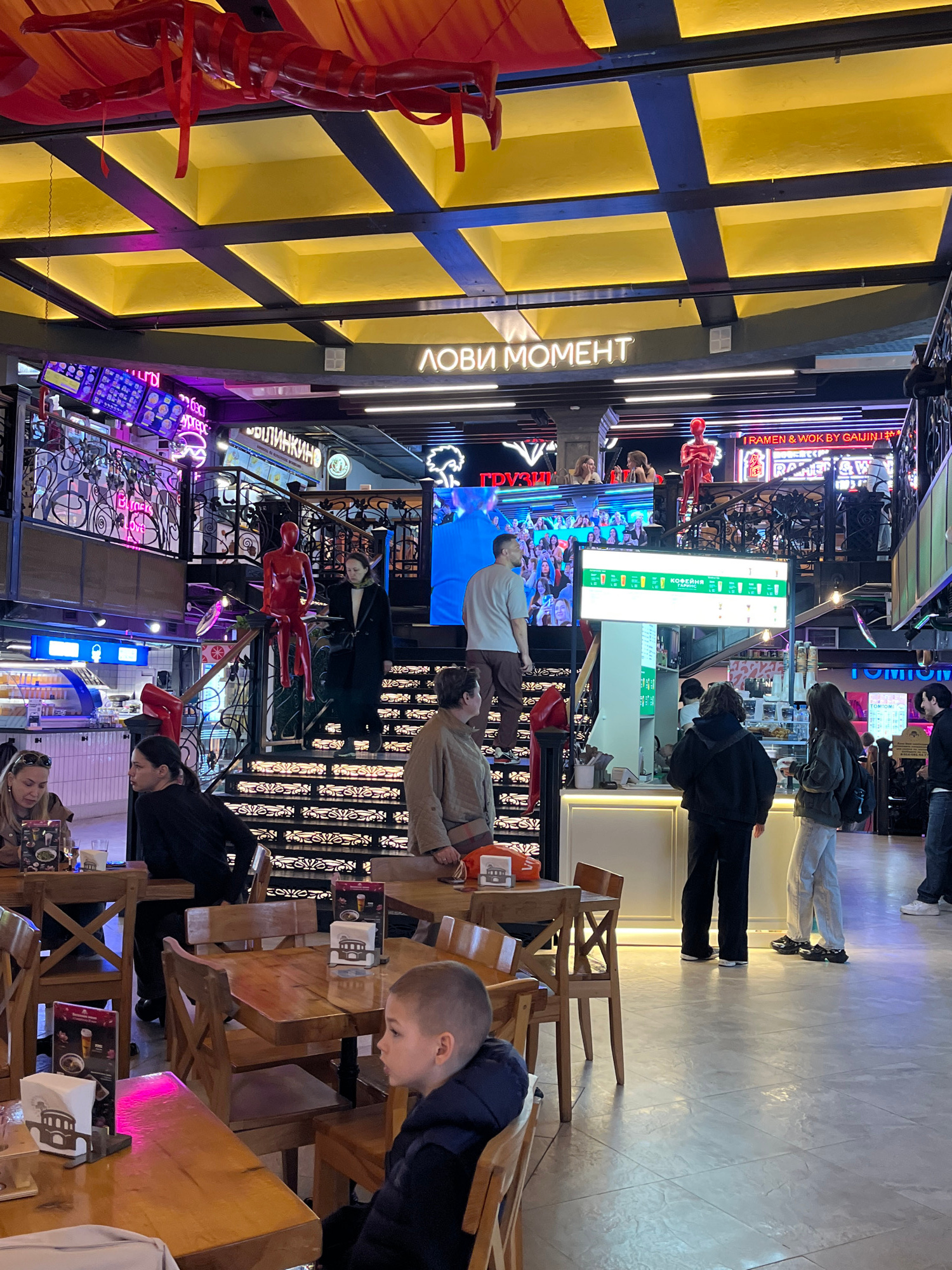 The image is an interior shot of what appears to be a multilevel food court or dining area, probably located in a shopping mall in Moscow, Russia. The setting is characterized by a mix of seating ar…read more