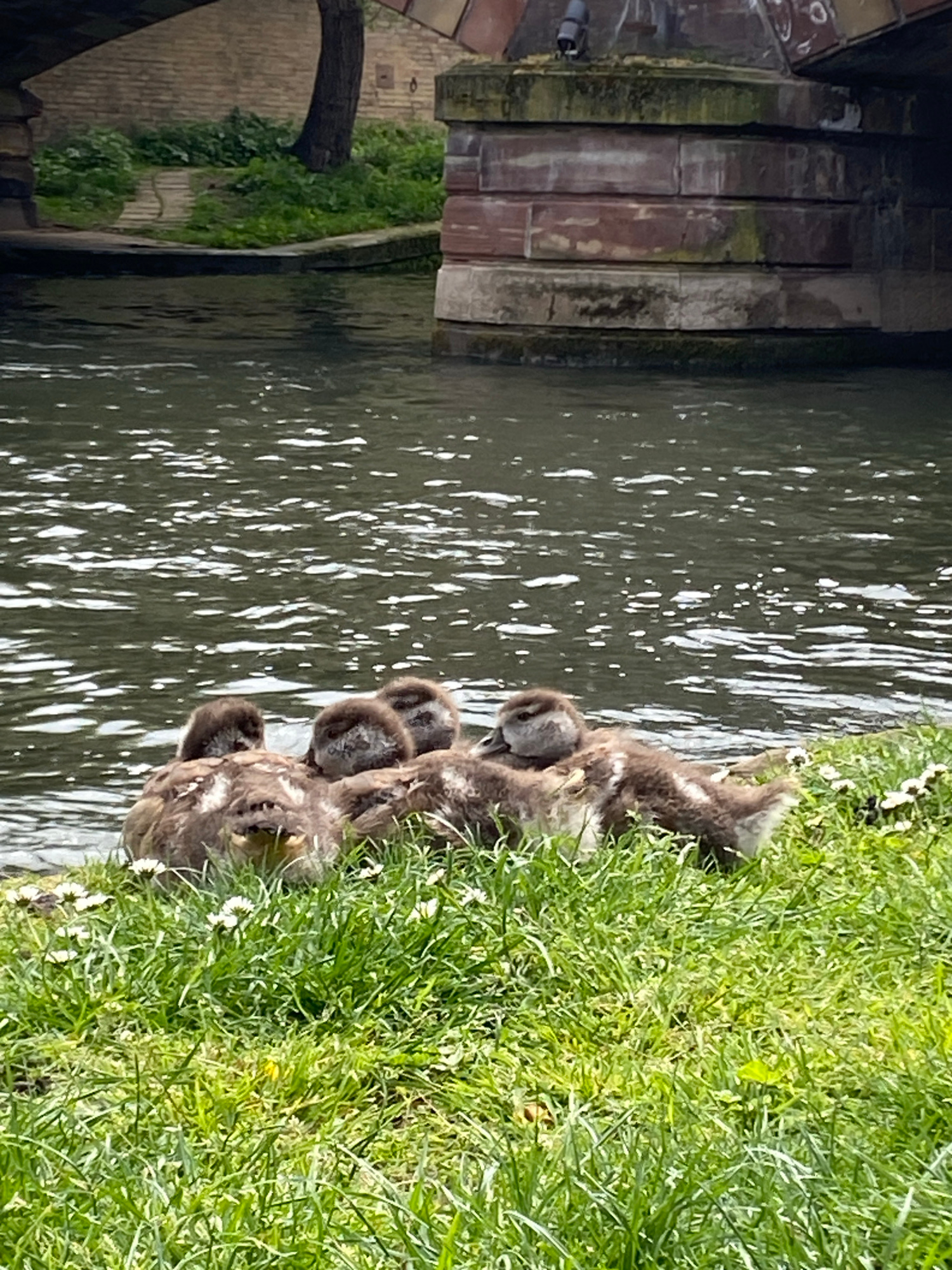 A line of ducklings sits on the edge of a grassy bank, adjacent to a body of water reflecting sunlight. The bank is lush with green grass and small white flowers. The ducklings are grey and fluffy. Toβ¦read more