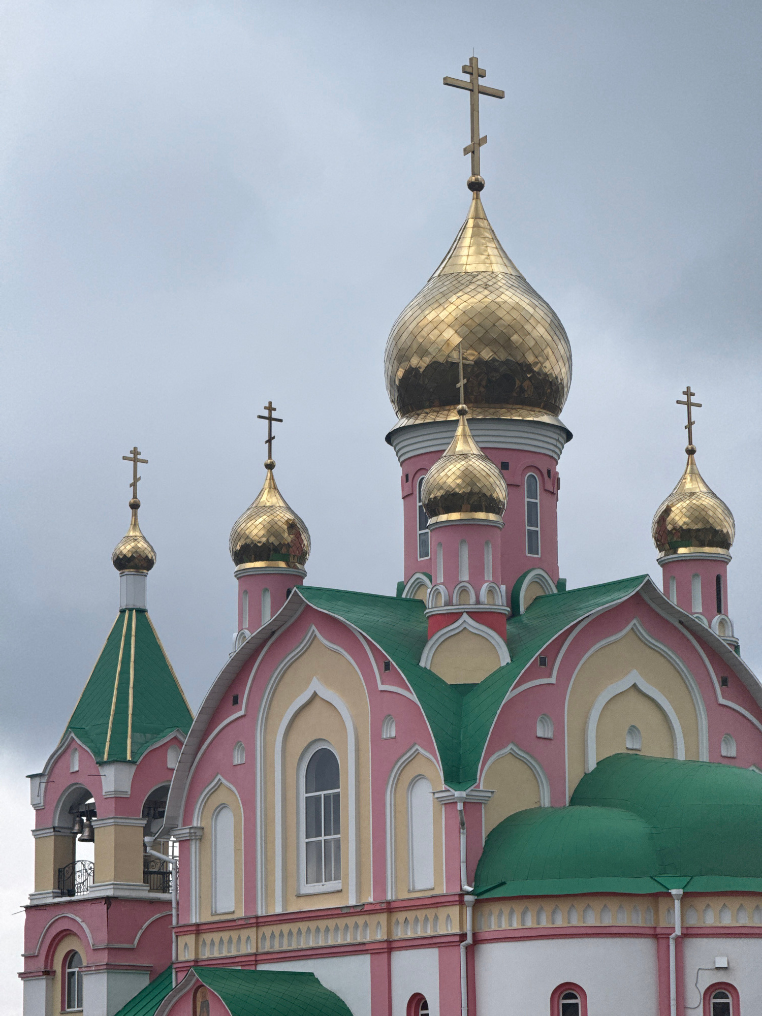 The image shows a portion of the Church of the Icon of the Mother of God in Kurchatov, Russia. The church features colorful architecture with a pink and white facade, green roofs, and multiple golden…read more